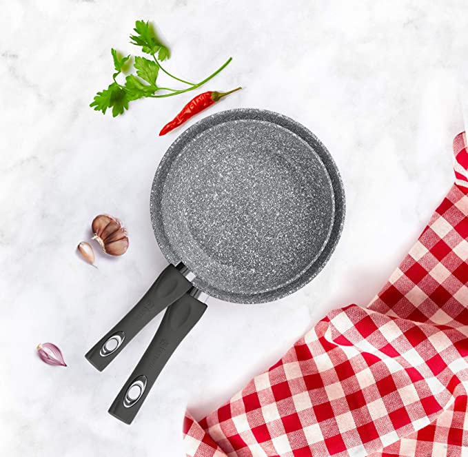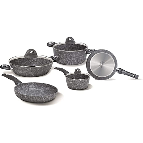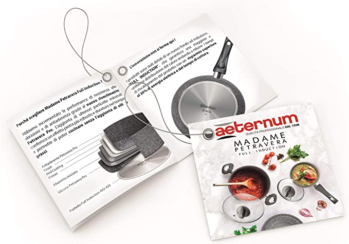 Materiale Metallo - Marchio Aeternum - Batteria 8 Pezzi - Madame Petravera 3.0 è la linea semiprofessionale ottima per cucinare sui piani ad induzione; Lo speciale fondo Full induction riduce del 30 % i tempi di cottura riducendo proporzionalmente i consumi energetici - Lo speciale fondo Full induction riduce del 30 % i tempi di cottura e proporzionalmente i consumi energetici; Lo speciale rivestimento antiaderente Petravera Pro, rinforzato con particelle minerali, assicura una maggior resistenza e durata del prodotto nel tempo e permette di cucinare cibi sani, senza olii e grassi aggiunti; Rivestimento antiaderente PFOA e NICKEL FREE - Realizzate con un corpo in alluminio ad elevato spessore che garantisce performace di cottura eccellenti; Il rivestimento antiaderente è particolarmente resistente e assicura una lunga durata; la presenza di microparticelle di pietra permette una cottura nauturale, sana e priva di olii e grassi aggiunti; Grazie al manigliame ergonomico in bachelite con finitura soft, l'utilizzo risulta pratico e la presa salda e sicura - Le maniglie rivettate garantiscono una resistenza massima, l'impugnatura ergonomica realizzata con finitura soft touch garantisce una presa salda e sicura; Il materiale in bachelite mantiene una temperatura bassa che impedisce di scottarsi afferrando le maniglie - La confezione include: Padella 20 cm; Padella 24 cm; Casseruola 1 manico 16 cm; Casseruola 2 manici 20 cm; Tegame 28 cm; Coperchio 16 cm; Coperchio 20 cm; Coperchio 28 cm - La batteria di pentole include strumenti ideali per cuocere dalle 2 alle quattro porzioni; ottima per cotture su piani ad INDUZIONE grazie allo speciale piattello FULL induction che assicura una massima compatibilità con tutti i piani ad induzione e riduce del 30% i tempi di cottura; adatta per cottura anche su piani a gas, vetroceramica e radianti - La finitura esterna satinata, elegante e moderna, dona un appeal professionale al prodotto