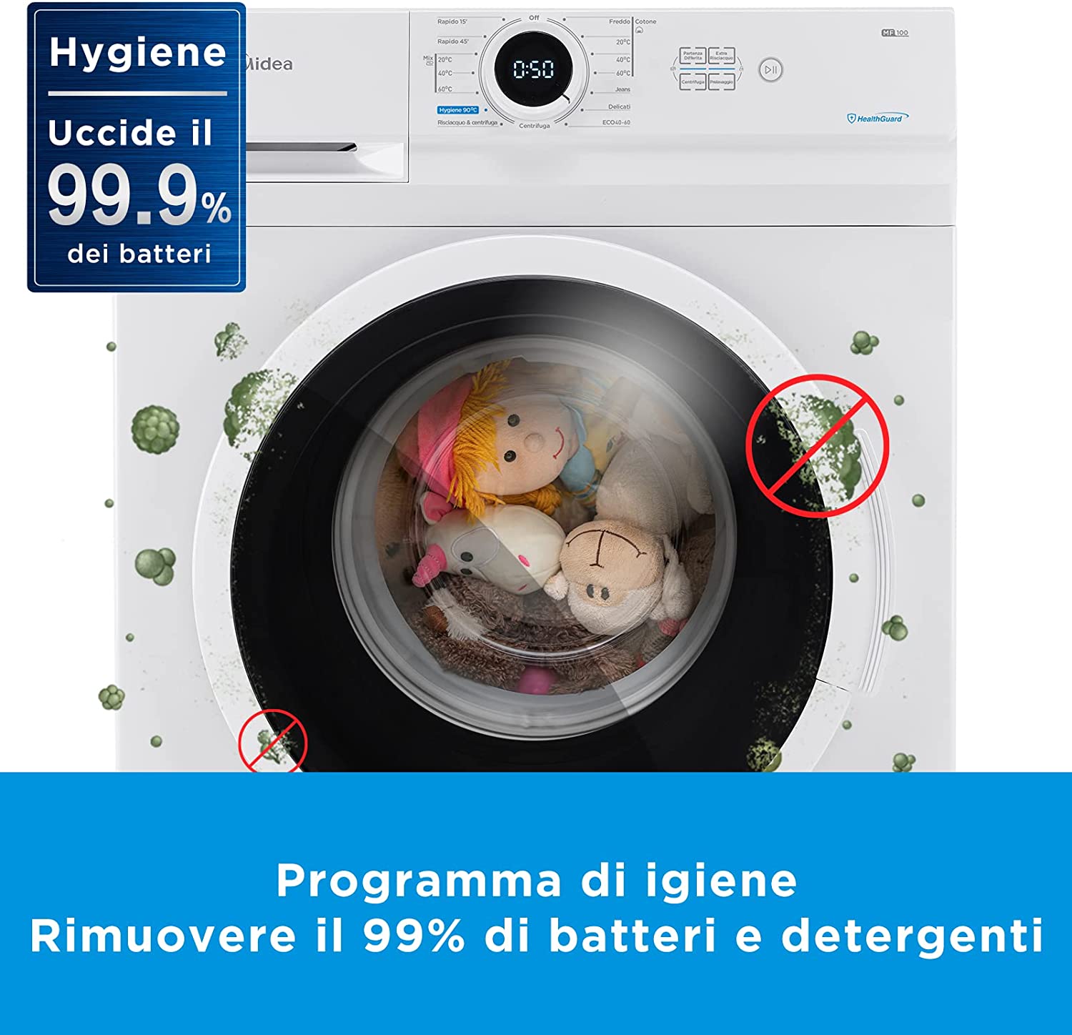 Midea MF100W70/E - Lavatrice a Carica Frontale, 40cm di profondità Slim Design, 1200 U/min, 7 kg, Hygiene 90 ℃, Opzioni di Temperatura Multiple, Colore Bianco. 5 diverse temperature tra cui freddo-20℃-40 ℃-60 ℃-90 ℃ per lavare abiti con materiali diversi e mantenere gli stessi sempre come nuovi. Un ulteriore funzione di lavaggio per pulire le macchie pesanti.