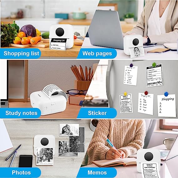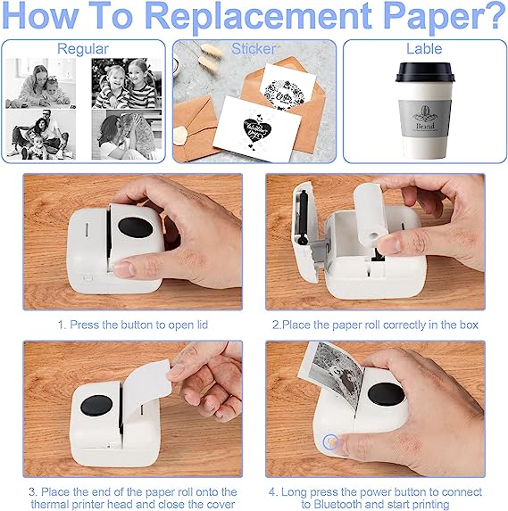 la stampante termica Bluetooth adotta la tecnologia di stampa termica, non utilizza inchiostro, che è più comodo da usare, più ecologico, interessante e pratico. Nota: dopo aver utilizzato la stampante fotografica per molte volte, se la stampa non è nitida, è possibile utilizzare alcol per pulire la barra laser della stampante (la barra laser si trova nel vano del caricatore della carta).Connessione istantanea Bluetooth alla stampante: la stampante utilizza la connessione Bluetooth dell'APP