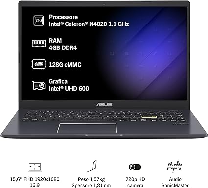 L'innovativo display NanoEdge con cornice sottile offre più spazio utilizzabile sullo schermo per una visione immersiva. Consente inoltre a uno schermo più grande di adattarsi a uno chassis più piccolo, offrendoti un laptop con un ingombro più compatto. Il design senza ventole mantiene bassi i livelli di rumore, quindi non sarai distratto quando lavori su un foglio di calcolo o guardi un film. Con il compatto e leggero Vivobook Go 15, la produttività è sempre a portata di mano. Si infila facilmente nello zaino o nella piccola borsa in modo da poter svolgere i compiti o creare contenuti ovunque tu sia. Nuova esperienza di utilizzo grazie a Windows 11, sistema operativo completamente reinventato e semplificato per garantirti una nuova esperienza di connessione istantanea alle persone che ami, alle tue app preferite, alle informazioni di cui hai bisogno e ai giochi che ti piacciono di più - Nome modello: ASUS Vivobook Go - Dimensioni schermo: 15,6 Pollici - Colore: Black - Modello CPU: Celeron N - Dimensioni memoria RAM: 4 GB