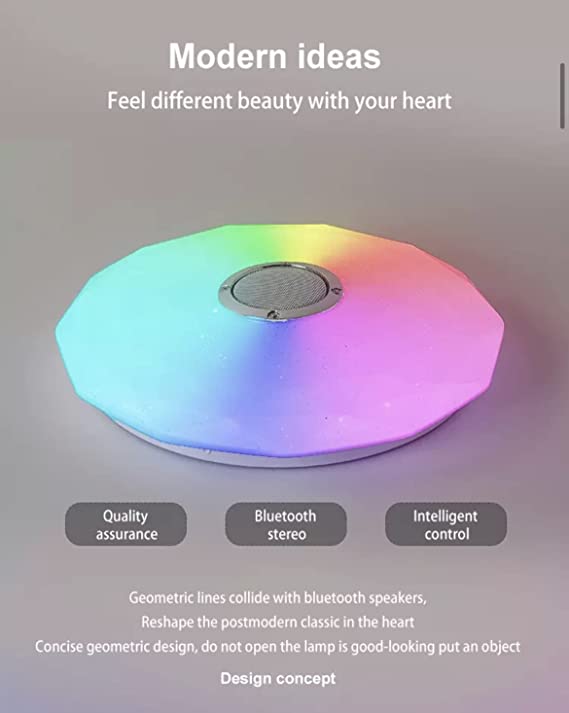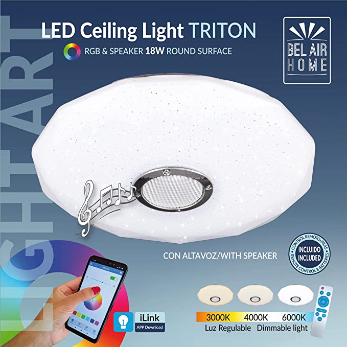 BEL AIR HOME - Plafoniera LED Soffitto Dimmerabile, Luce delle stelle, Lampada Soffitto con Altoparlante Bluetooth, RGB Lampada Musicale con Cambio Colore, Telecomando e Controllo App,18W - Plafoniera LED RGB con 18 W di consumo e 33 cm di diametro con un design moderno - Ha un altoparlante per ascoltare musica attraverso di esso con connettività bluetooth - Può essere controllata tramite il telecomando incluso e dal telefono cellulare con l'app ILINK disponibile per Android e IOS - Luce LED integrata con 18 W di consumo con la possibilità di metterla in 3000K-4000K-6000K o il colore RGB che si desidera con una vasta gamma di colori diversi