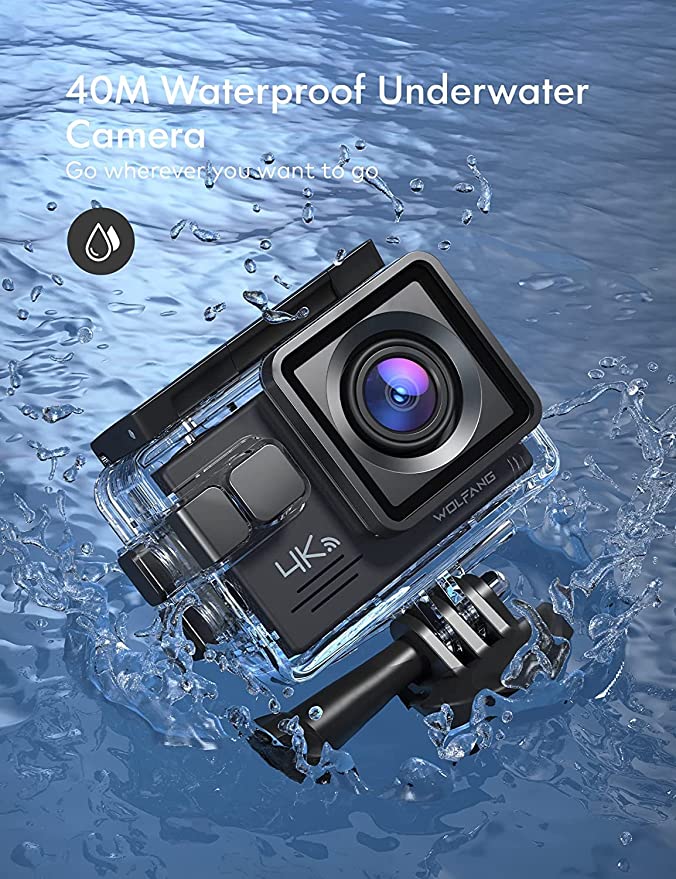 WOLFANG Action Cam GA100 - 4K - 30FPS, 20MP -WiFi - PC Camera, Fotocamera per Casco, Subacquea 40M - Impermeabile - Videocamera, EIS, Telecomando 2.4G, Mic Esterno,2x1050mAh Batterie e Accessori di Montaggio. La action cam WOLFANG GA100 ha una risoluzione video 4K nativa, risoluzione video disponibile: 4K/30fps, EIS 2.7K/30fps, EIS 1080P/60fps, EIS 1080P/30fps, EIS 720P/120fps. Ha una risoluzione fotografica di 20 MP e altre risoluzioni da 8 MP a 20 MP disponibili. Questa action cam GA100 ha un microfono esterno e puoi usarlo quando registri in un ambiente rumoroso per ottenere una voce chiara. La fotocamera è inoltre dotata di molti altri accessori, come telecomando, supporto per manubrio della bicicletta, fibbia J-hock, telaio della fotocamera, copertura antipolvere, cinturino per casco, supporto girevole a 180°, supporto girevole a 360°, clip per collare e altro bracci di estensione. Advance EIS e Multi Mode: Il giroscopio di stabilizzazione a 3 assi integrato mantiene in posizione la stabilizzazione elettronica dell'immagine. La tecnologia di stabilizzazione EIS resiste a collisioni, jitter o inclinazioni della fotocamera quando utilizzata, garantendo immagini e video chiari e stabili. La cam ha anche molte modalità per soddisfare le diverse esigenze delle persone, come registrazione in loop, time-lapse, rallentatore, scatto con timer, foto a raffica, modalità auto, etc. Involucro impermeabile e durevole da 40 M: WOLFANG GA100 è realizzato in materiale durevole aggiornato, la custodia migliora il livello di impermeabilità da 30 M a 40 M. E le persone non si preoccupano mai di infiltrazioni d'acqua durante le immersioni, inoltre, questa funzione la rende una fotocamera funzionante nei giorni di pioggia o neve. - Connessione WiFi e controllo del telefono: WOLFANG GA100 supporta una connessione WiFi integrata a uno smartphone e puoi controllare la registrazione tramite il telefono e vedere più chiaramente tramite il grande schermo, scaricare le foto direttamente sul telefono e condividerle