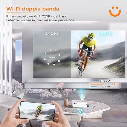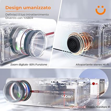 Dual-Band Connessione e Bluetooth 5.0】YABER V5 è il primo mini proiettore sul mercato che supporta WiFi dual-band a 5GHz e 2,4GHz, WiFi 5G supporta velocità wireless più elevate. V5 fornisce il sistema audio SRS e la funzione Bluetooth 5.0, che può connettersi liberamente con cuffie Bluetooth, altoparlanti Bluetooth e Airpod. Nuova borsa per proiettore e treppiede aggiornati + gratuiti - Molto più luminoso, con un rapporto di contrasto di 10000: 1, questo mini videoproiettore offre immagini più nitide rispetto ai normali proiettori, supporta anche Full HD 1080P. Inoltre, questo bellissimo mini proiettore portatile può essere utilizzato anche come decorazione per una stanza grazie al suo design liscio e compatto. Supporto per obiettivi Full HD 1080 ad alta risoluzione - Mini proiettore V5 aggiornamento 2022 nativo 1280x720p (compatibile con 1920x1080p), alta luminosità 8500 lumen e rapporto di contrasto 10000:1 16:9/4:3; il guscio ha una maggiore durata Abrasione e superiore resistenza alla temperatura. L'uso di lussuose e moderne lenti in metallo, elevata trasmissione della luce e alta rifrazione, fornisce immagini di nitidezza eccellente e immagini a colori ad alta riproduzione. Funzione Zoom / Schermo di proiezione grande - Lo schermo di proiezione può essere ridotto al 75% regolando lo schermo senza spostare il proiettore. Supporta dimensioni di proiezione da 45