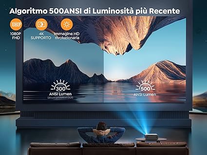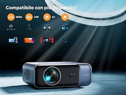 Questo proiettore FHD YABER 2023 utilizza la più recente tecnologia di auto focus/Keystone Correzione. L'autofocus consente di posizionare il proiettore in qualsiasi posizione a 1-6 m dalla parete. Metterà a fuoco automaticamente l'immagine di proiezione ad alta definizione, il che è molto conveniente. La correzione auto del trapezio può rendere l'immagine di proiezione un'immagine rettangolare perfetta. Effettivo: su e giù ± 30 °, sinistra e destra ± 10 °- WiFi 6, Bluetooth 5.1: Il proiettore nativo 1080P offre diverse modalità di condivisione interattiva: WiFi 6 e 5.1 Bluetooth, porta di ingresso HDMI/USB/AV, uscita audio da 3,5 mm. WiFi 6 supporta reti a banda larga 2.4G e 5G. Tablet e telefoni cellulari possono facilmente realizzare proiezioni wireless al proiettore. Il proiettore supporta la connessione con altoparlanti e cuffie Bluetooth per ottenere lo stesso suono surround del cinema. 500 ANSI, Nativo 1080P, Supporta 4K: 500ANSI del proiettore può essere utilizzata nell'ambiente di spegnere le luci e chiudere le tende di notte o di giorno. La frequenza dei fotogrammi è 50Hz e l'immagine del gioco può anche essere giocata senza intoppi. L'immagine proiettata dalla sorgente luminosa LED con una temperatura di colore di 8500K non causerà affaticamento oculare anche se vista per lungo tempo. L'ingresso USB può riprodurre video 4K. - Funzione zoom 100% - 50%, posizionato sul desktop / soffitto: Questo proiettore wifi Bluetooth full HD 1080p può essere posizionato sul tavolo o sul ripiano per la proiezione e può anche essere installato sul soffitto per la proiezione. Allo stesso tempo, la sua funzione zoom può regolare la dimensione dell'immagine di proiezione al 50% - 100%. A una distanza di 1m dal proiettore, il decibel di rumore è solo 45dB - Il proiettore full HD YABER 1080p ha 140000 ore di vita della lampada e funzione di risparmio energetico ed è posizionato in un luogo ben ventilato quando utilizzato. Una borsa di stoccaggio è inclusa nella confezione