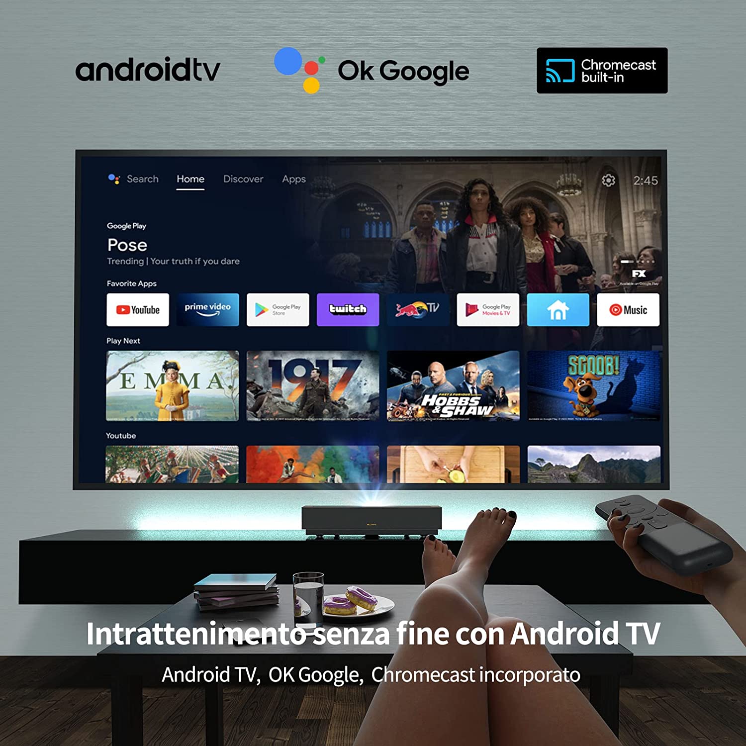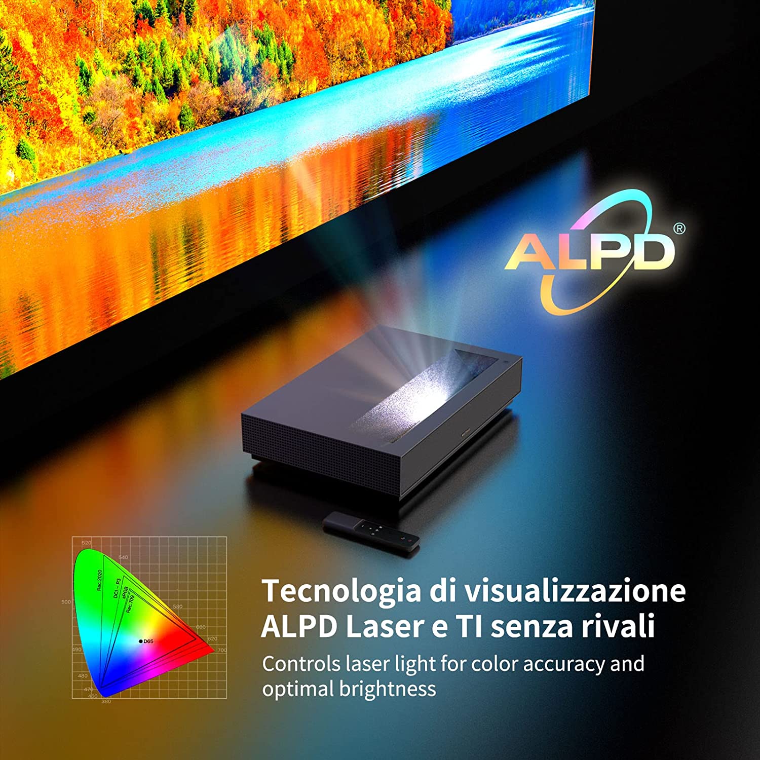 WEMAX Nova 4K UHD - Proiettore laser - Android TV - Proiettore intelligente dal raggio ultra corto - Immagine HDR10 da 150 pollici-TV laser WiFi Bluetooth UST per film,video-Telecomando a comando vocale. Nova è costruito con 4K UHD e 2100 ANSI lumen (sorgente luminosa da 5000 lumen). È dotato di tecnologia ALPD 3.0 e TI DLP brevettata, leader del settore. La tecnologia ALPD consente di utilizzare la luce in modo più efficiente per ottenere dettagli più precisi in una gamma di colori più ampia e una maggiore vivacità. Il proiettore a breve distanza riduce l'affaticamento degli occhi diffondendo la luce senza perdere la qualità dell'immagine. Con il proiettore laser WEMAX Nova puoi scegliere tra quattro diverse dimensioni di proiettore. Un enorme schermo di dimensioni fino a 150