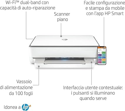 FUNZIONALITA': stampante multifunzione a getto d'inchiostro a colori, fronte e retro automatico, possibilità di stampa anche senza bordi - CONNETTIVITA': è possibile stampare da pc, smartphone e tablet con l'app HP Smart che si connette ai dispositivi attraverso il Wireless Dual Band, Wi-Fi Direct, AirPrint e Mopria; Cavo USB non incluso - STAMPA: fino a 20 ppm in bianco/nero, 17 ppm a colori, a getto d'inchiostro, con risoluzione fino a 300 x 300 dpi, su carta comune A4, A5, A6 con grammatura da 60 a 90 g/m², buste, carta fotografica - Questa è una stampante HP+: per funzionare richiede un account HP, una connessione Internet continua e l'uso esclusivo di cartucce di inchiostro originali HP per tutta la vita della stampante - CON HP+ OTTIENI 1 ANNO DI GARANZIA SUPPLEMENTARE E 3 MESI DI INSTANT INK INCLUSO CON HP+; Instant Ink è un servizio che ti consegna le cartucce a domicilio prima che tu rimanga senza e ti consente di stampare a partire da 0,99€ al mese Questa stampante include un firmware che contiene misure di sicurezza dinamica volte ad impedire l'utilizzo di cartucce non originali con chip o circuiti elettronici non HP, pertanto le cartucce che utilizzano un chip o un circuito elettronico non HP potrebbero non funzionare o potrebbero smettere di funzionare - La stampante HP è compatibile con le cartucce originali: HP 305 Nero, HP 305 Tricromia, HP 305XL Nero, HP 305XL Tricromia