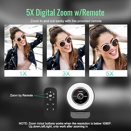 Webcam Angeltube con luce ad anello multifunzione per un miglior ritratto: La webcam in streaming è costruito in 3 diversi colori LED e step-less luminosità regolabile per fornire luce di tono più luminoso e più morbido senza abbagliamento. Basta premere il pulsante a sfioramento per cambiare le temperature di colore. Una ghiera rotante permette di cambiare rapidamente il livello di luminosità e di accendere/spegnere la luce senza bisogno di andare nelle impostazioni del software. - 60FPS 1080p Webcam con Auto Focus, Angetube web camera fornire liscio e cristallino Video, catturare ogni dettaglio in tempo reale. Anche quando si registra in condizioni di luce scarsa o fioca, la fotocamera si regola in modo intelligente per offrire la migliore immagine. L'autofocus in tempo reale fa sì che non dobbiate mai preoccuparvi di regolare la lunghezza focale. (Webcam zoomabile con telecomando omnidirezionale RF 360°) Telecomando di alta qualità con zoom digitale 5X sotto 1080P, disabilita il video, silenzia il microfono, regola il FOV e il bilanciamento del bianco ecc. Regola la luminosità della web camera in /Mac OS/Windows senza software. Questa è una grande comodità per gli utenti Mac. Doppio microfono incorporato e otturatore per la privacy: Doppio microfono omnidirezionale incorporato con cancellazione del rumore garantisce un audio chiaro da ogni angolo. Il coperchio per la privacy incorporato e il video disattivabile a distanza ti permettono di godere di una vita digitale sicura sul web quando non sei in uso e impediscono agli hacker di spiarti.