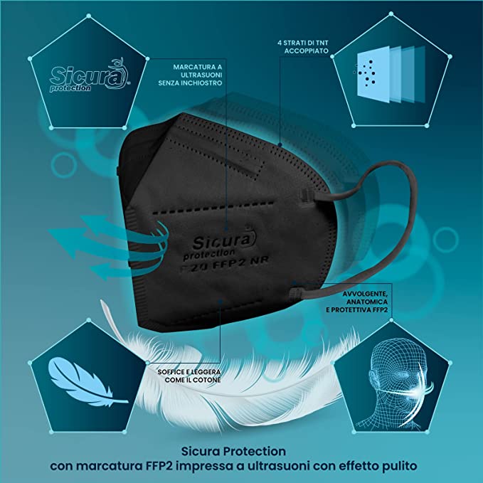 50 Mascherine FFP2 Nere Certificate CE - Made in Italy -BFE ≥99% certificate ISO 13485 e ISO 9001