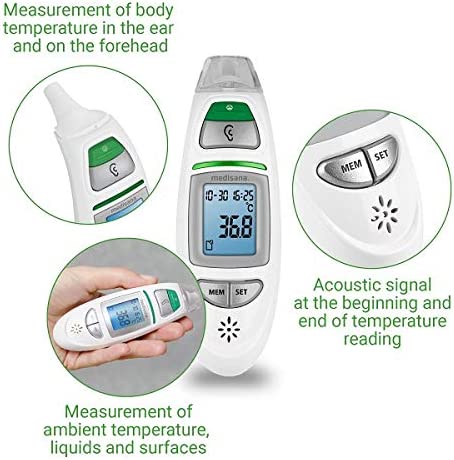 Termometro auricolare per neonati, bambini e adulti, frontale con allarme visivo di febbre, funzione di memoria e misurazione di liquidi. Termometro per la fronte: Ora puoi facilmente controllare la tua temperatura tirando il termometro dalla tua tempia sulla fronte all'altra tempia Multifunzione: Con il nostro termometro a infrarossi è possibile determinare non solo la vostra temperatura corporea, ma anche la temperatura delle superfici e dei liquidi, nonché la vostra temperatura ambiente Fronte o orecchio: potete decidere se preferite misurare la temperatura sulla fronte o sull'orecchio - Allarme visivo della febbre: Il termometro della febbre segnala un aumento della temperatura corporea con l'aiuto dell'allarme visivo della febbre attraverso un cambiamento di colore sul display. Data + ora: oltre ai valori misurati, il termometro clinico a infrarossi TM 750 visualizza anche la data e l'ora