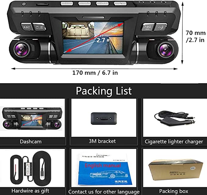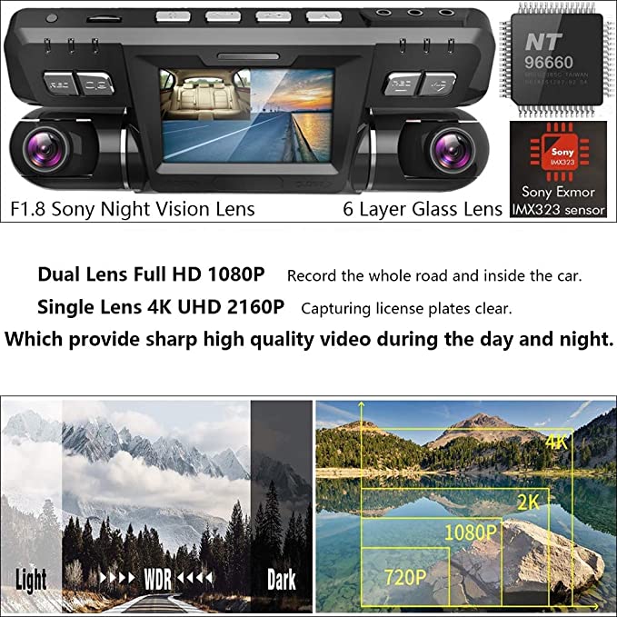4K - WiFi - GPS - Dash Cam, Anteriore e Posteriore - Doppia - 360° Ruotabile - 170 Gradi Grandangolare - Registrazione Continua e Sony WDR per Visione Notturna - Doppio obiettivo - FHD 1080P, registra simultaneamente l'intera strada e l'interno dell'auto; Obiettivo singolo - 4K 2160P UHD, acquisizione di targhe chiare. WDR regola l'esposizione per creare immagini bilanciate,- Fornisce video nitidi di alta qualità durante il giorno e la notte come prove in caso di incidente. Il sistema di sicurezza ADAS avviserà il conducente quando la distanza di due auto è troppo breve o la strada è sfalsata - Monitoraggio da Atti Vandalici attivato dal G-sensore e dal Rilevamento del Movimento, la dash cam avvia automaticamente la registrazione e blocca i file quando rileva il movimento - Eccellente registrazione audio con il microfono incorporato - Supercondensatore incorporato, resistente al freddo e al calore (-20°F a 176°F), A prova di esplosione - La Registrazione Continua sovrascriverà automaticamente il filmato più vecchio e lo sostituirà con i nuovi video - Supporta la scheda SD 256 GB (opzionale), Full HD 1080P può registrare ininterrottamente per circa 26 ore, quindi non è necessario preoccuparsi di rimanere senza spazio di archiviazione. Doppia lente girevole a 360 ° e installazione nascosta per una varietà di parabrezza di automobili