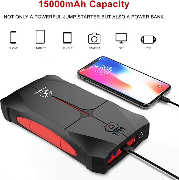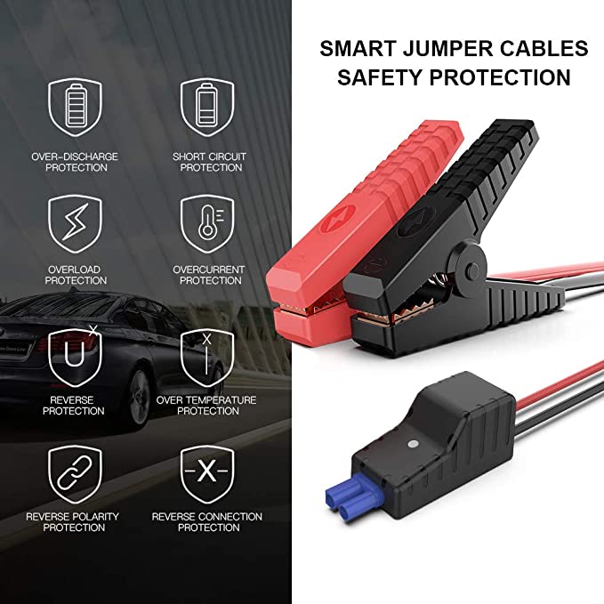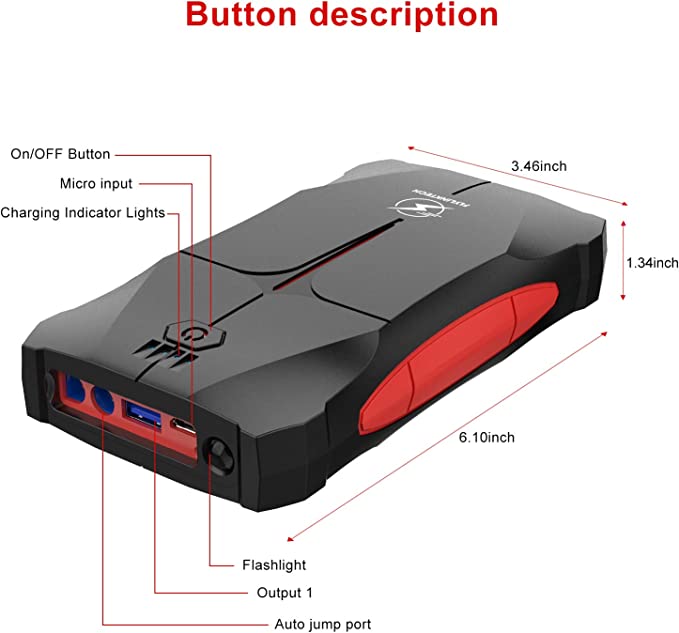 Car Jump Starter con 800 ampere di corrente di picco può sopperire alla batteria scarica di auto, SUV, camion o furgone (5L benzina o 4L motore diesel) in pochi secondi fino a 30 volte. Questo alimentatore di avviamento è anche un power bank compatto con capacità di 13200 mAh, carica i tuoi telefoni, tablet o altri dispositivi e velocità fino a 2,1 amp. Questa batteria ausiliaria con grado di protezione IP67, è resistente all'acqua e alla polvere, può essere utilizzata anche in caso di pioggia. Questo alimentatore di avviamento per auto dispone di 4 modalità di illuminazione a LED (normale, SOS, strobo e spento) che è un salvavita di emergenza quando si va in campeggio, picnic, avventura all'aria aperta o indagini. La tecnologia di sicurezza brevettata della clip della batteria intelligente ha una protezione contro le esplosioni e inversione di polarità, che impedisce alla pinza di cortocircuitare, alta temperatura, sovratensione, sovraccarico, sovra-scarica, sovracorrente e inversione di polarità