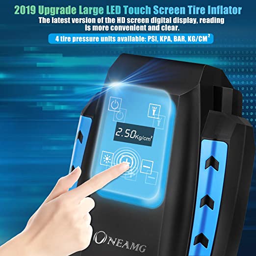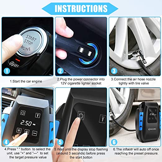Compressore Portatile per Auto Aria Compressa Pompa Elettrica 150PSI - Gonfiatore Digitale con Luce LED per Gonfiare Le Gomme delle Moto e delle Auto, Palloni, Canotti . Ci vogliono solo 5 minuti per gonfiare un pneumatico R17 da 0 a 2,5 bar! E’ adatto per biciclette, motocicli e piccole/medie autovetture (SUV incluso).Il rumore non supera i 50 dB. Tecnologia semplice e utile nella pompa dell'aria dell'automobile. Quando il pneumatico raggiunge la pressione desiderata,il compressore d'aria dell'automobile si spegnerà automaticamente. Il compressore d'aria portatile è dotato di un ampio display ad alta precisione e luminoso che ti aiuterà a calcolare i valori richiesti PSI, BAR, KPA, KG / CM². Monitoraggio della pressione dei pneumatici, vengono aggiunti 3 ugelli aggiuntivi, che consentono di gonfiare rapidamente auto, moto, biciclette, fuoristrada, jeep, palloni sportivi, materassini gonfiabili e giochi d'acqua