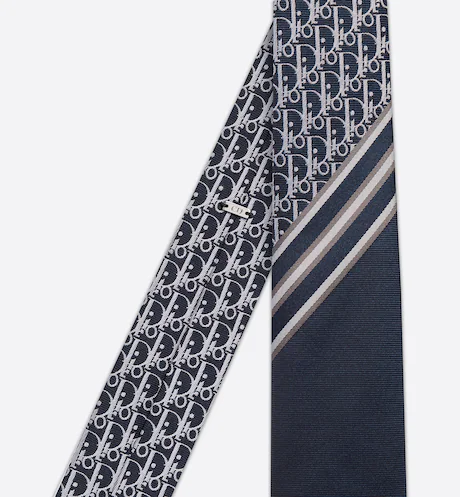 Questa cravatta in seta blu navy presenta il motivo Dior Oblique impreziosito da strisce in jacquard bianche e grigie. Elegante e ricercata, dona un tocco grafico a ogni abito. Jacquard Dior Oblique bianco con strisce bianche e grigie. Targhetta con firma “CD” e finitura color argento - 100% seta