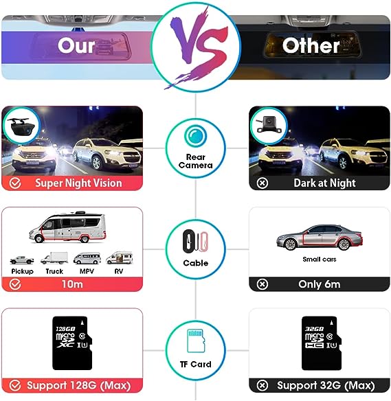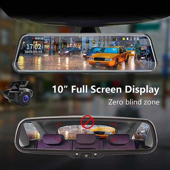 Ottimizzando la tecnologia di elaborazione delle immagini e migliorando la soppressione della luce,la visibilità notturna è notevolmente migliorata. Utilizzo di una colla nano impermeabile per ottenere un grado di impermeabilità elevato e antipolvere IP69. Dash cam 10'' touch screen full HD 1080P visione notturna della fotocamera,inclusa telecamera posteriore impermeabile HD 1080P IP69,cavo fotocamera posteriore lungo 10m,supporto 128G SD card max(Non incluso) - Visualizzazione a schermo intero, senza punti ciechi - Jansite dash cam specchietto utilizzando la tecnologia di streaming ad alta definizione, sia la videocamera 1080P anteriore che la videocamera posteriore 1080P offrono una qualità video eccezionale, non preoccuparti più di non vedere chiaramente altre targhe. Trasmissione in tempo reale di immagini, visualizzazione a schermo intero, la dash cam a specchio con obiettivo grandangolare elimina i punti ciechi. Visione notturna eccellente e parcheggio sicuro - L'alta definizione della videocamera di backup 1080P offre una visione notturna eccellente in condizioni di scarsa illuminazione e il display della videocamera di backup con linee guida ti aiuta a parcheggiare in sicurezza. (Nota: Il filo rosso della telecamera posteriore deve essere collegato al cavo positivo della luce di retromarcia.) - Interfaccia utente premurosa e amichevole per il tuo funzionamento. La luminosità può essere regolata facendo scorrere lo schermo verso sinistra e verso destra sullo schermo. Inoltre, ecco alcune importanti raccomandazioni per il funzionamento delle impostazioni per l'uso quotidiano: livello del sensore G su Basso, registrazione in loop su 3min, Rilevazione movimento su Off, Monitoraggio parcheggio su Sopra. Facile installazione - Con l'esclusivo cavo per telecamera posteriore lungo 10 metri, è facile e puoi installare le telecamere anche per veicoli di grandi dimensioni.