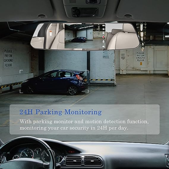 Full HD 1080P e Grandangolare: Basato su un chipset avanzato, fotocamera frontale Full HD 1080P ad angolo ampio e 4 luci LED con Telecamera posteriore Full HD 720P per garantire la cattura di immagini di alta qualità anche di notte. Sistema di monitoraggio inverso: Dotato di una fotocamera posteriore impermeabile, fornisce una cattura d’immagine posteriore che si attiva nell’inserire la retromarcia. Delle linea guida di parcheggio verranno mostrate, che potranno guidare il conducente durante la procedura di parcheggio. Touchscreen da 4,8 Pollici: Questa cam è dotata di un display touchscreen da 4,8 pollici per offrire facilità di funzionamento nel controllo e nell'anteprima. Specchietto Retrovisore: Non si tratta solo di una fotocamera con doppio obiettivo ad alta risoluzione, ma anche uno specchietto retrovisore. Funzionalità eccellente con vetro blu antiabbagliante avanzato 2.5D, che offre una visione posteriore chiara e completa. Installazione Facile: È molto facile installare questa cam da cruscotto a specchio, basta installarlo sul precedente specchietto retrovisore con le cinghie di gomma in dotazione, non è necessario rimuovere lo specchietto retrovisore dell'automobile.