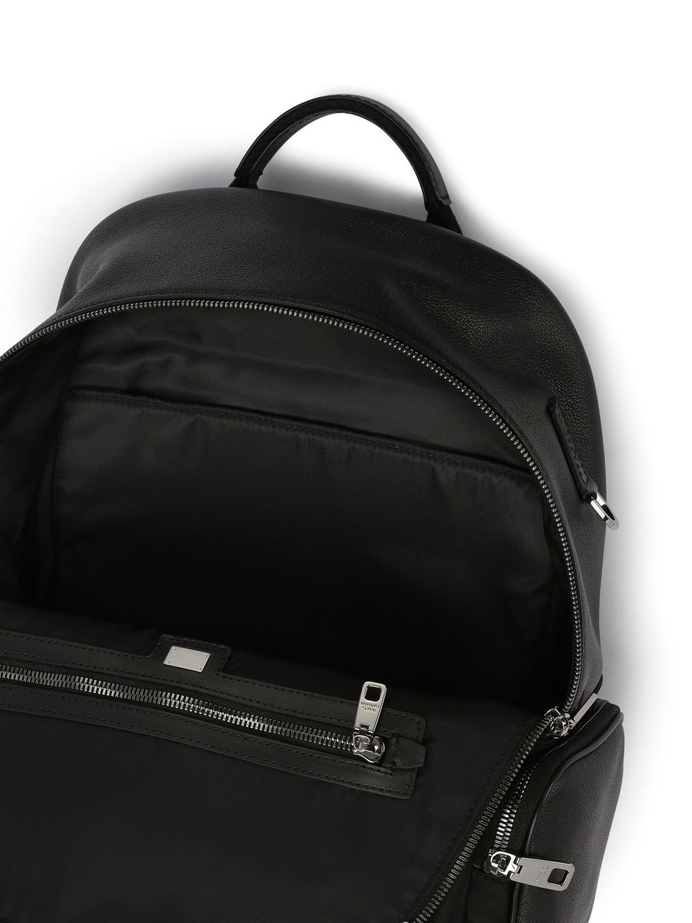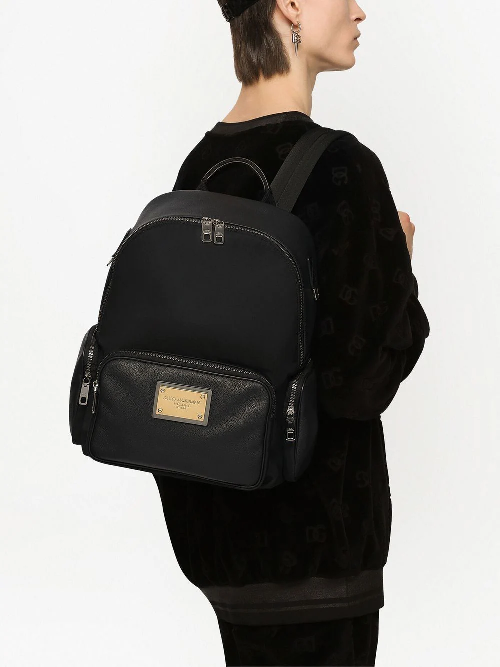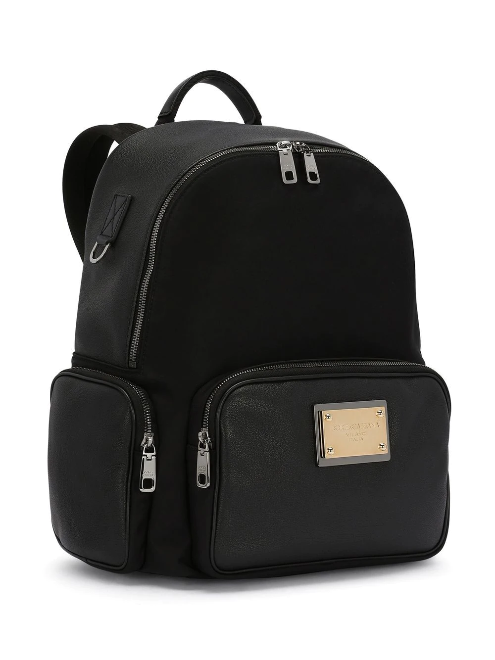 Dolce & Gabbana - Zaino con tasche - Nero, placca con logo, chiusura superiore con zip, tasca frontale con zip, due tasche laterali con zip, manico tondo e spalline regolabili. Origine: Italia - Composizione:Fodera: Nylon 70%, Pelle Di Vitello 10%, Gomma Stirene-Butadiene (SBR) 10%, Rayon 6%, Cotone 4% - Esterno: Nylon 42%, Pelle Di Vitello 30%, Poliestere 15%, Rayon 10%, Acrilico 3%