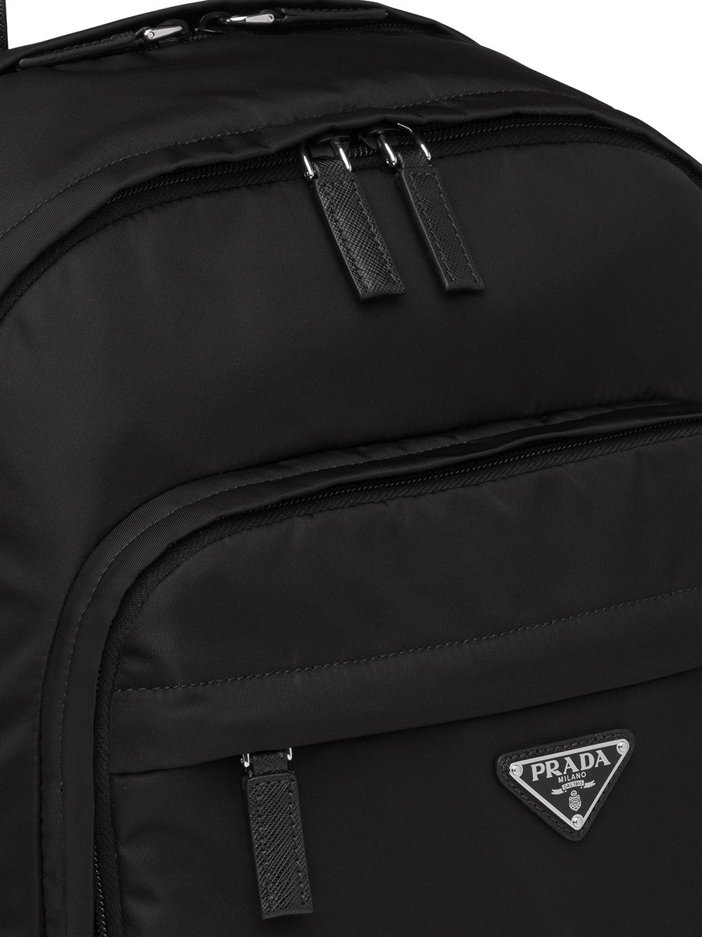 Prada - Zaino con zip - Triangolo in smalto con logo, spalline regolabili, manico singolo, chiusura con zip a giro, applicazione interna con logo, chiusura frontale con zip, tasca frontale con zip e dettagli color argento. Colore: nero. POSITIVELY CONSCIOUS: almeno il 50% dei materiali principali di cui è composto questo prodotto rispetta i nostri criteri Conscious – per esempio, sono biologici, riciclati, di recupero o ecosostenibili Composizione: Esterno: Pelle 100%, Nylon Riciclato 100%