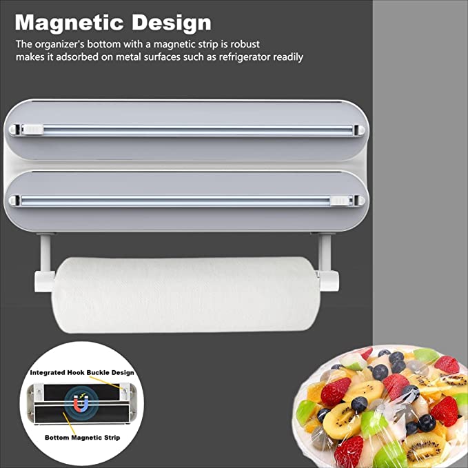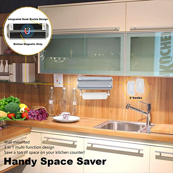 Dispenser e taglierina magnetica per film - Supporto per rotolo da cucina 3 in 1 montato a parete, Dispenser carta stagnola in alluminio con supporto per asciugamani carta. Supporto per rotolo di carta da cucina + Dispenser e taglierina per pellicola trasparente e stagnola, il design all-in-one consente di inserire carta oleata, stagnola e un rotolo di carta assorbente - DESIGN MAGNETICO: il fondo del dispenser di fogli e pellicole è dotato di un potente magnete che lo fa aderire facilmente alle superfici metalliche come i frigoriferi. Viene fornito con 2 ganci sul retro, in modo da poterlo appendere in qualsiasi punto della parete o del piano di lavoro, per confezionare gli alimenti in modo rapido e semplice - un pratico salvaspazio in cucina. TAGLIERINA A SCORRIMENTO DI SICUREZZA: la taglierina per pellicole aderenti è dotata di 2 lame a scorrimento nascoste e bidirezionali, affilate e resistenti. Funzionamento sicuro . L'involucro di plastica esce in modo uniforme e si taglia in modo rapido e ordinato