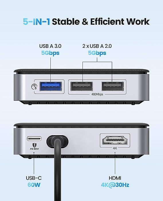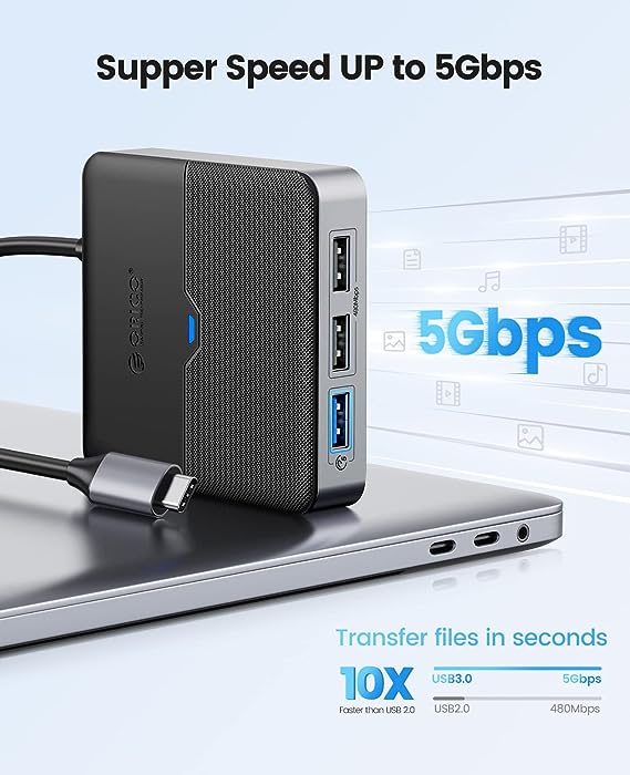 Hub multifunzionale 5 in 1- Questo hub USB C di ORICO è dotato di 5 porte in un unico design compatto, tra cui uscita video HDMI 4K, porta di ricarica PD da 60W e 3 porte USB-A (1 a 5Gbps e 2 a 480Mbps). È compatibile con MacBook Pro, iPad, laptop Lenovo, Dell, HP e altri ancora. Questa docking station è facile da usare e non richiede driver aggiuntivi. Visualizzazione HDMI 4K Cristallina - Con la porta HDMI 4K è possibile trasmettere audio e video di alta qualità al televisore HD, al monitor o al proiettore. L'hub supporta risoluzioni fino a 4K@30Hz, o compatibile con 1080P@120Hz e 2K@120Hz, offrendo immagini cristalline e vivide per il lavoro o l'intrattenimento. Ricarica Power Delivery da 60W - Questo hub USB C supporta fino a 60W di ricarica power delivery, assicurando che il vostro laptop sia sempre acceso e pronto all'uso. Fornisce inoltre energia aggiuntiva per dischi rigidi, unità DVD e altri accessori collegati alle porte USB, consentendo di lavorare ininterrottamente per periodi più lunghi. Trasferimento dati veloce - L'hub USB C è dotato di una porta USB-A 3.0 a 5Gbps e di due porte USB-A 2.0 a 480Mbps, che garantiscono velocità di trasferimento dati fulminee per tutti i dispositivi USB. Collegate il mouse e la tastiera senza ritardi. Questo hub è perfetto per l'uso in movimento. Compatto & Affidabile L'hub USB-C è progettato con dimensioni compatte che possono essere facilmente riposte in tasca, nella borsa o nel borsellino. È inoltre dotato di fori per la dissipazione del calore nella parte superiore e inferiore per garantire che il dispositivo rimanga fresco