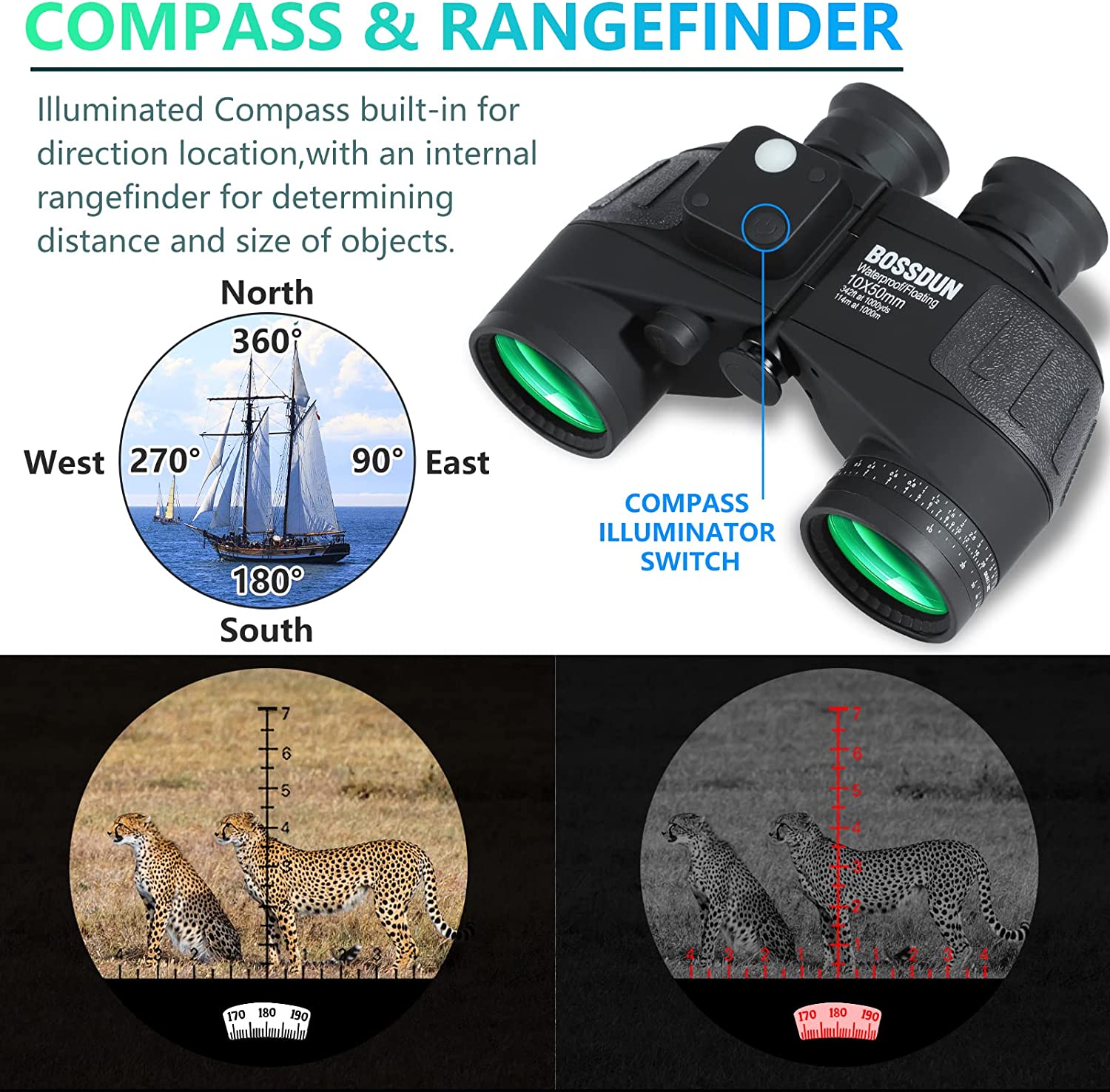 5 standard militari, anti-bussare, resistenti agli urti, anti-allagamento, alta (+ 55 ℃) e bassa (-43 ℃) resistenza alla temperatura; Bussola digitale illuminata e binocolo militari integrati e telemetro perfetti per caccia,osservazione marina, osservazione di animali, turismo, sci di fondo e tutte le attività all'aperto ecc. HD progettato, ingrandimento 10 volte; Obiettivo da 50 mm; campo visivo di 396 piedi 1000 iarde; prisma Bak-4 di qualità premium; lenti ottiche multistrato FMC, che consentono di godere di una visione ampia e chiara grazie all'elevata penetrazione dell'obiettivo e alla sua elevata raccolta di luce, e fai in modo che oggetti e paesaggi distanti siano chiaramente visibili nei tuoi occhi. Riempito con azoto secco e sigillato con O-ring per protezione impermeabile per prevenire la polvere, l'appannamento e danni da umidità in condizioni ambientali estreme e in qualsiasi condizione atmosferica; Questo è anche un binocolo marino militare per una migliore protezione impermeabile e galleggiare sull'acqua, quindi non preoccuparti se lasciato cadere nell'acqua. Grande oculare da 23 mm per una visione confortevole; Regola individualmente la nitidezza dell'oculare sinistro e destro meglio per le persone con visione diversa; Adattatore per treppiede per il montaggio del treppiede per una maggiore stabilità
