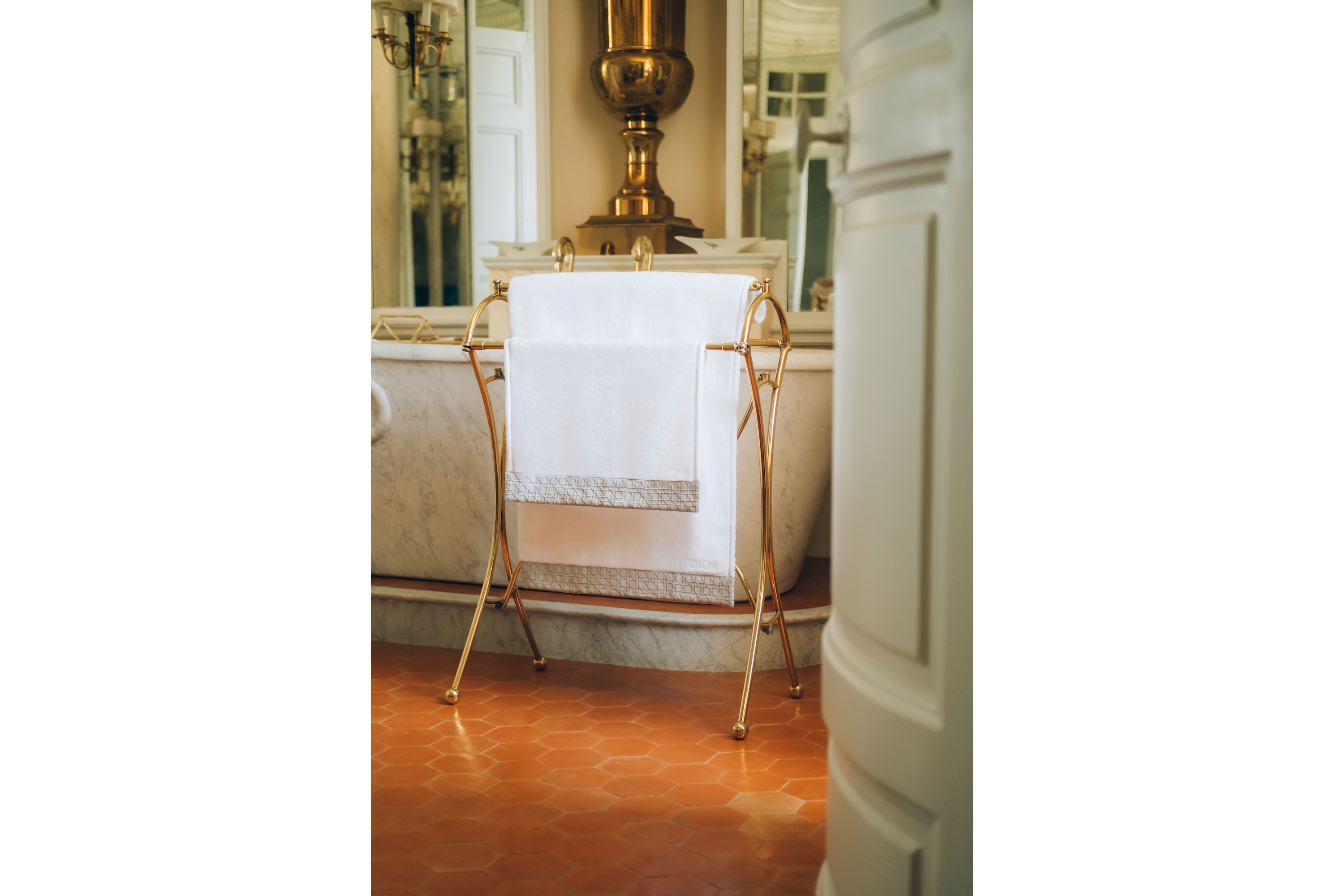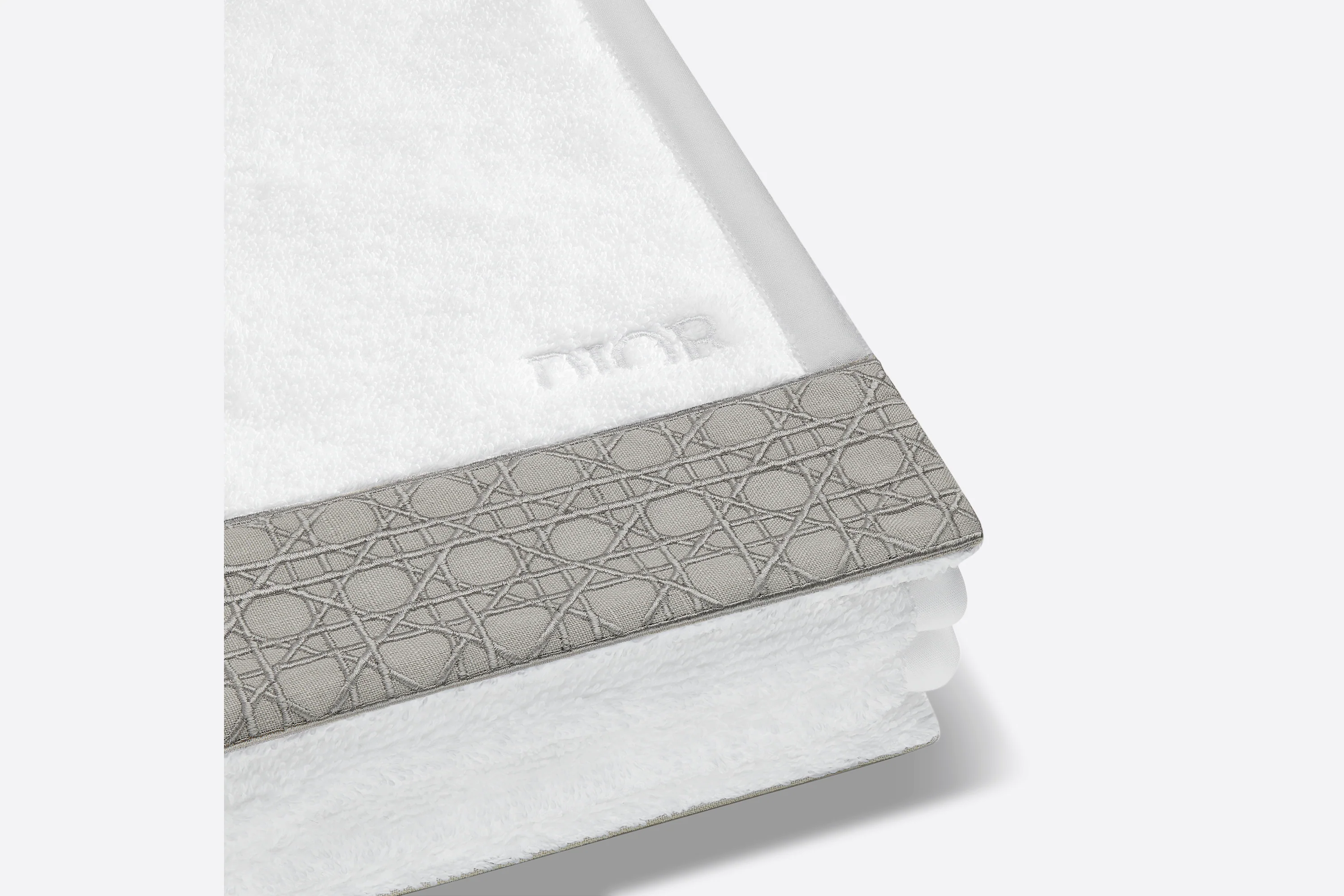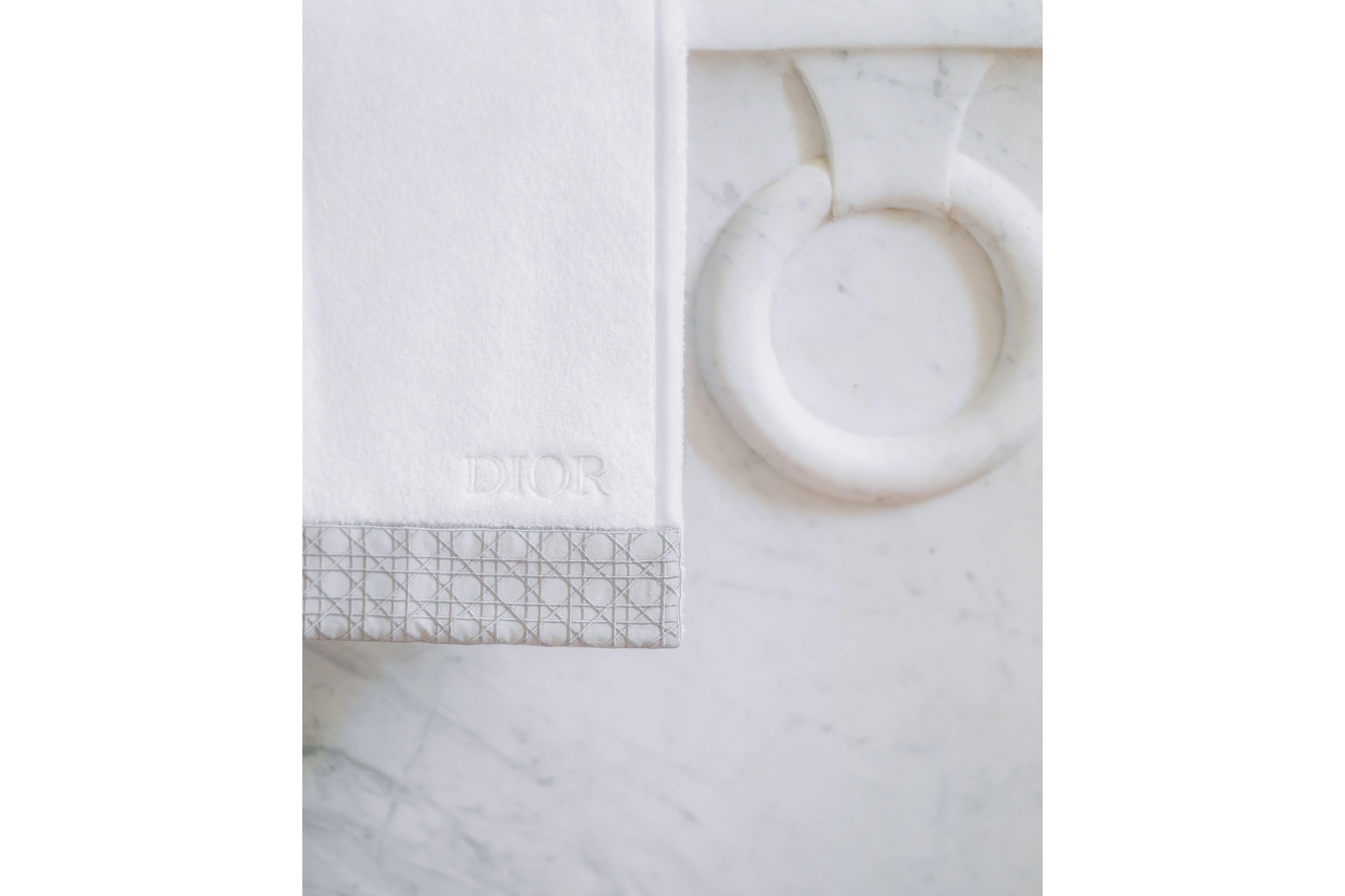 Coppia di asciugami Dior. Questi asciugamani, realizzati in un morbido misto di cotone e lino, sono impreziositi da un ricamo raffigurante l’iconico motivo Cannage. Fanno parte di una collezione di biancheria da bagno bianca decorata con una fascia intessuta grigia, che riflette l’art de vivre di Dior. 90% cotone, 10% lino - Made in France.Dimensioni: 45 x 70 cm