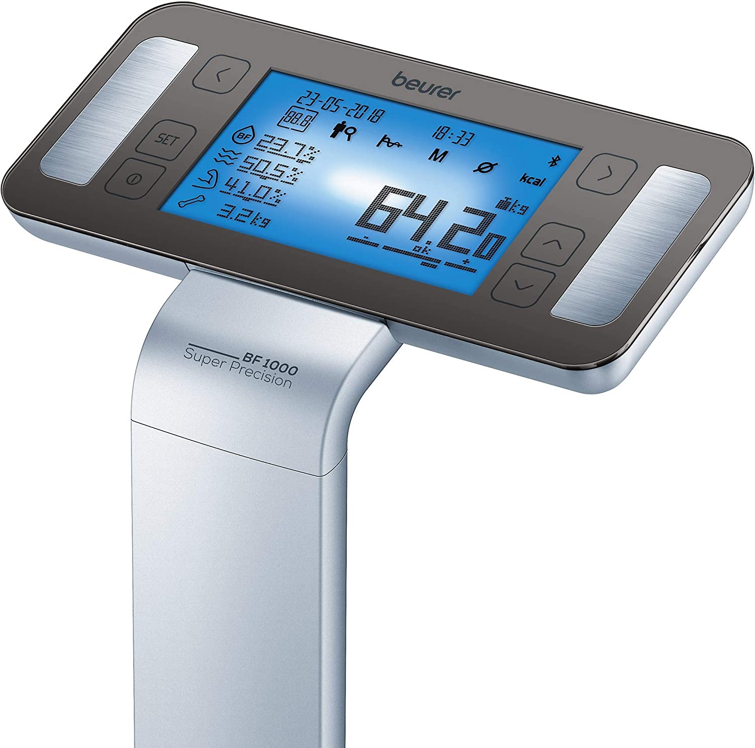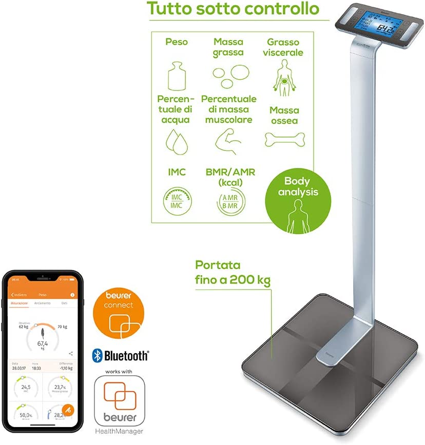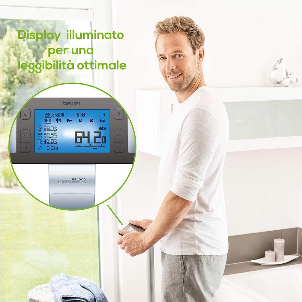 Beurer BF 1000 Super Precision Bilancia Diagnostica Professionale con Misurazione Incrociata, Connessione Bluetooth e con Portata fino a 200 Kg. Misurazione completa del corpo come un professionista La misurazione incrociata con otto elettrodi consente un'analisi precisa di tutto il corpo e la visualizzazione separata delle singole parti del corpo (braccia, gambe, tronco) - Misurazione del peso corporeo, del grasso corporeo, della percentuale muscolare, dell'acqua corporea e della massa ossea in modo più preciso rispetto alle bilance convenzionali, display di facile lettura sul display a matrice di punti rialzata (portata di 200 kg, graduazione 50 g) - Determinazione del grasso viscerale Misurando il grasso della pancia o il grasso degli organi, si possono trarre conclusioni sulla salute in relazione a malattie come il diabete o l'ipertensione - Con l'aiuto dei dati corporei raccolti, il turnover calorico viene calcolato come tasso metabolico di base e turnover dell'attività (tasso metabolico attivo) - Collegamento in rete tra smartphone e bilance per l'analisi del corpo Con l'app beurer HealthManager, tutti i valori misurati come peso e percentuale di grasso corporeo sono disponibili a colpo d'occhio durante il processo - Nota Per una misurazione migliore, stare a piedi nudi e fermi sulla bilancia.