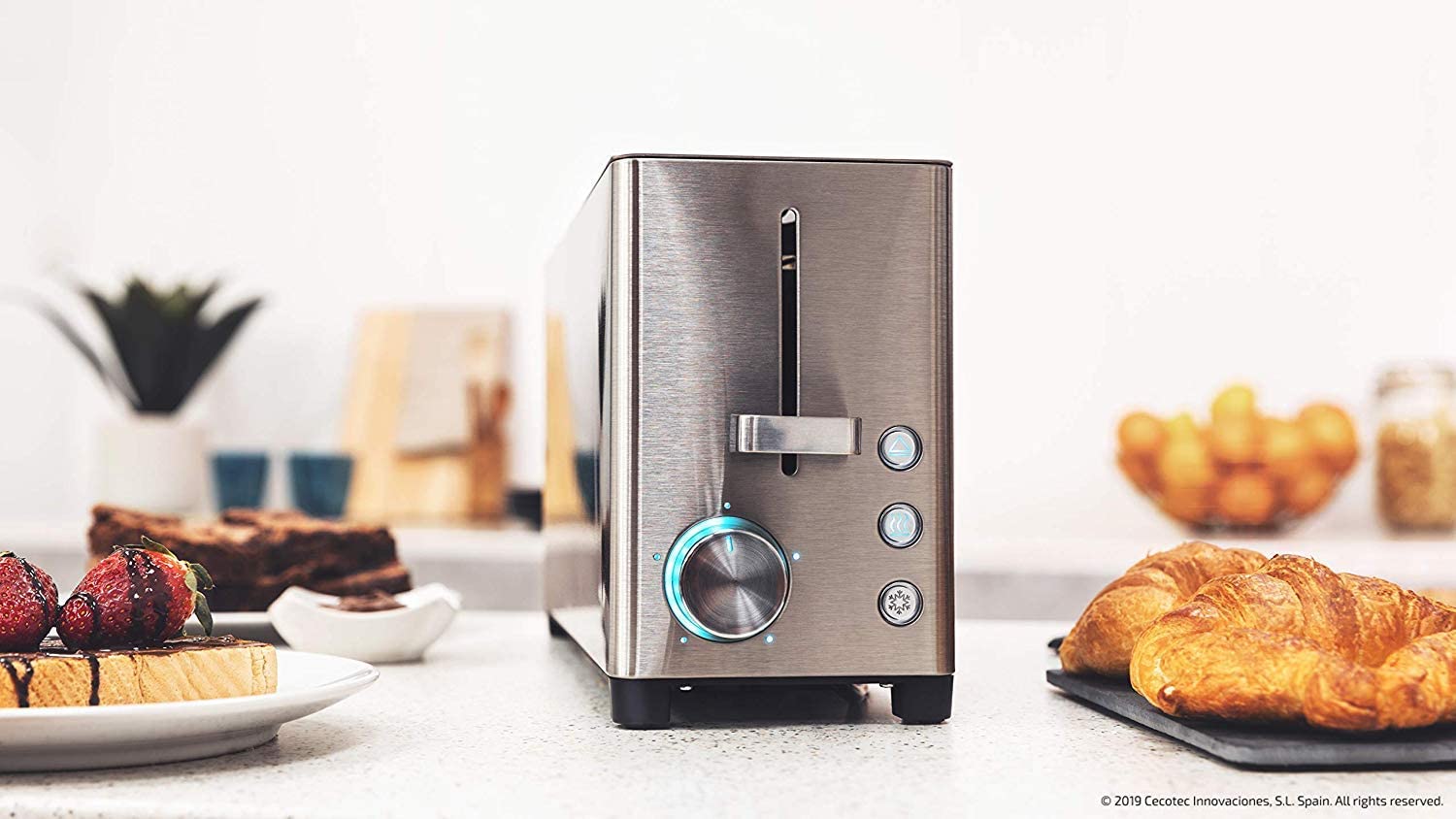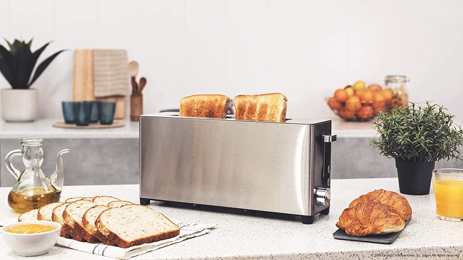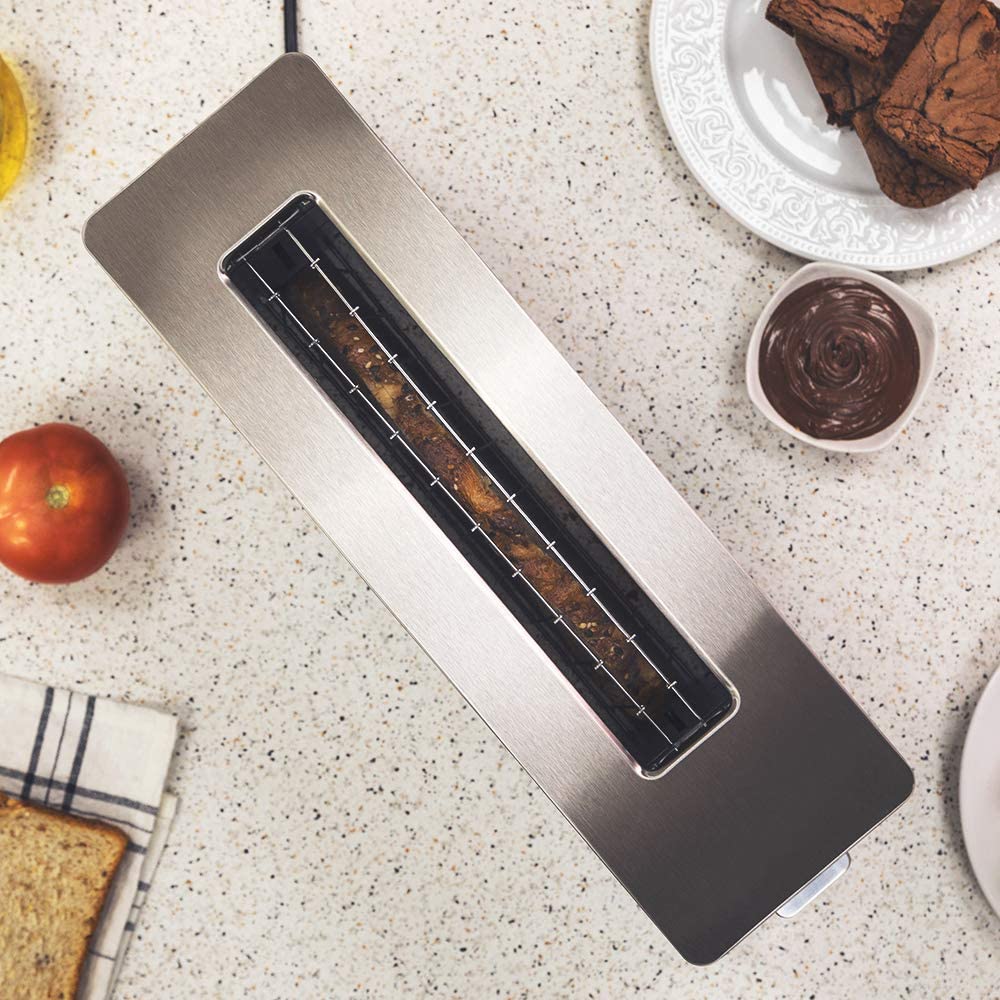 YummyToast - Tostapane con fessura lunga, superficie in acciaio INOX, 5 livelli di potenza, 2 funzioni preconfigurate, cassetto raccoglibriciole 1050 W. Tostapane a fessura lunga con 2 capacità di toast, 1050 W di potenza massima e un design elegante con finiture in acciaio inossidabile e spie LED. L'ampia fessura della bocca consente di ottenere pagnotte spesse o grandi. Ha anche aste superiori per aiutare a riscaldare cibi di grandi dimensioni come pasticcini, torte o cornetti. Ha due funzioni preconfigurate per riscaldare e scongelare sul posto e 5 livelli di potenza che consentono di regolare il livello di tostatura del pane. Funzione extra-lift per rimuovere facilmente il pane, particolarmente utile con i pezzi più piccoli. Vassoio raccogli briciole facile da rimuovere per una pulizia rapida e semplice.