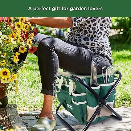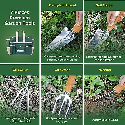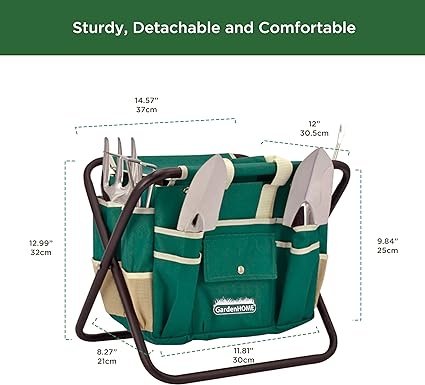 Marchio: GardenHOME - 7 Pezzi - Materiale: Legno, Lega di acciaio, Acciaio inossidabile - Dimensioni articolo: LxPxA: 46 x 41 x 6 cm - Leggero e portatile: Il set di attrezzi da giardino all-in-one non è solo robusto ma anche molto più leggero rispetto ai nostri concorrenti; progettato per soddisfare le esigenze di portabilità e durata in tutte le condizioni atmosferiche.- Strumenti in acciaio inossidabile con manici in legno: Tutti gli kit giardinaggio hanno teste in acciaio inossidabile con manici e fori in legno per un comodo stoccaggio e un livello di durabilità più elevato; grandi strumenti per rendere le attività di giardinaggio molto più semplici.- Borsa rimovibile in poliestere rimovibile: La borsa rimovibile in poliestere rimovibile può essere facilmente rimossa e lavata; ha tasche esterne per un facile accesso agli utensili da qualsiasi angolazione; tasca speciale per il tuo dispositivo mobile. Robusta borsa a mano e attrezzi da giardino: La borsa a mano è realizzata in cotone e poliestere di alta qualità per una maggiore durata e una facile pulizia. Il design a slot è adatto per riporre tutti gli strumenti, assicurando di non perdere nessuno strumento da giardinaggio e che siano facili da trasportare.- Il set attrezzi per il giardinaggio include 1 sgabello pieghevole resistente, 1 borsa di stoccaggio, 5 robusti attrezzi in acciaio inossidabile.