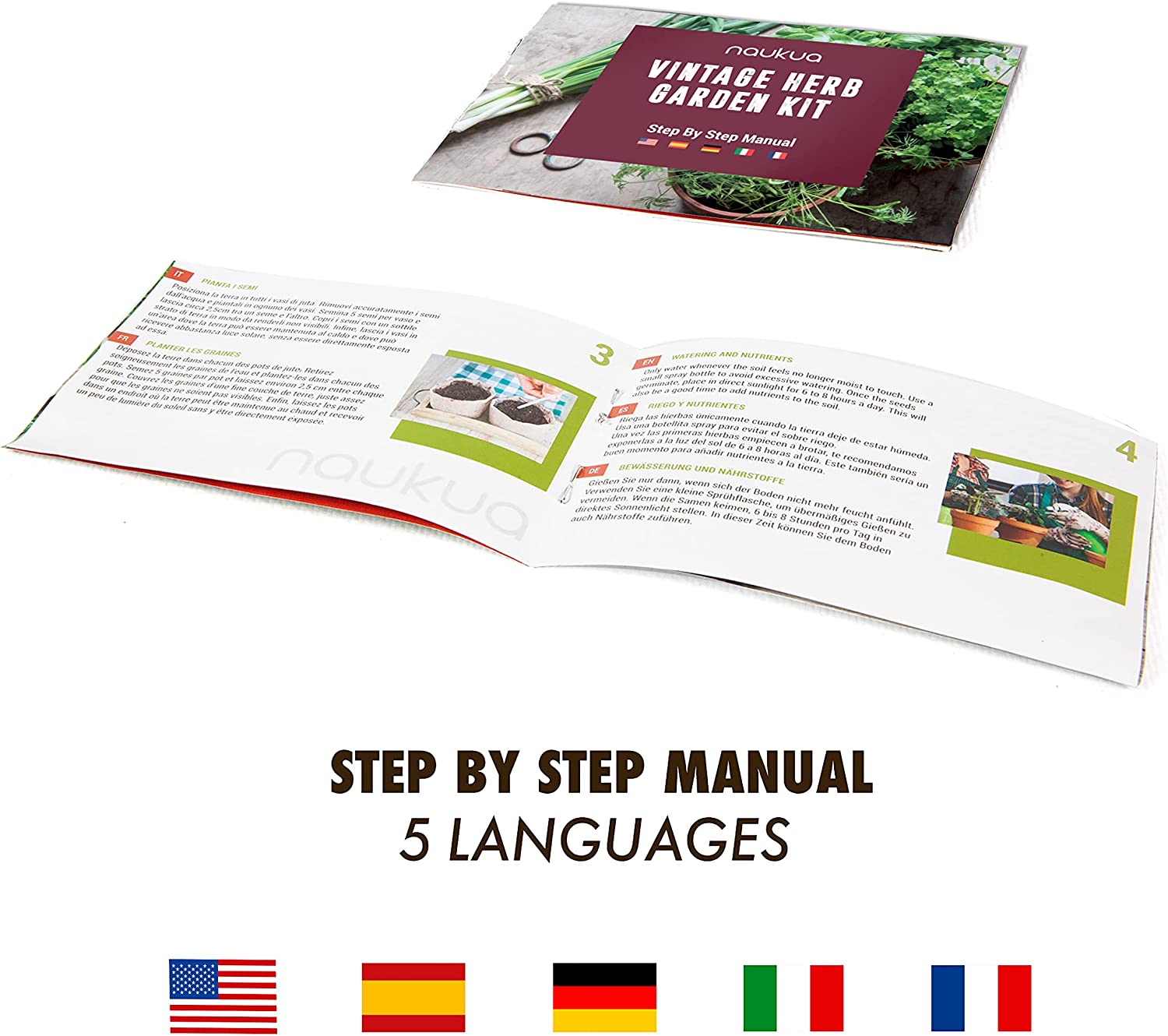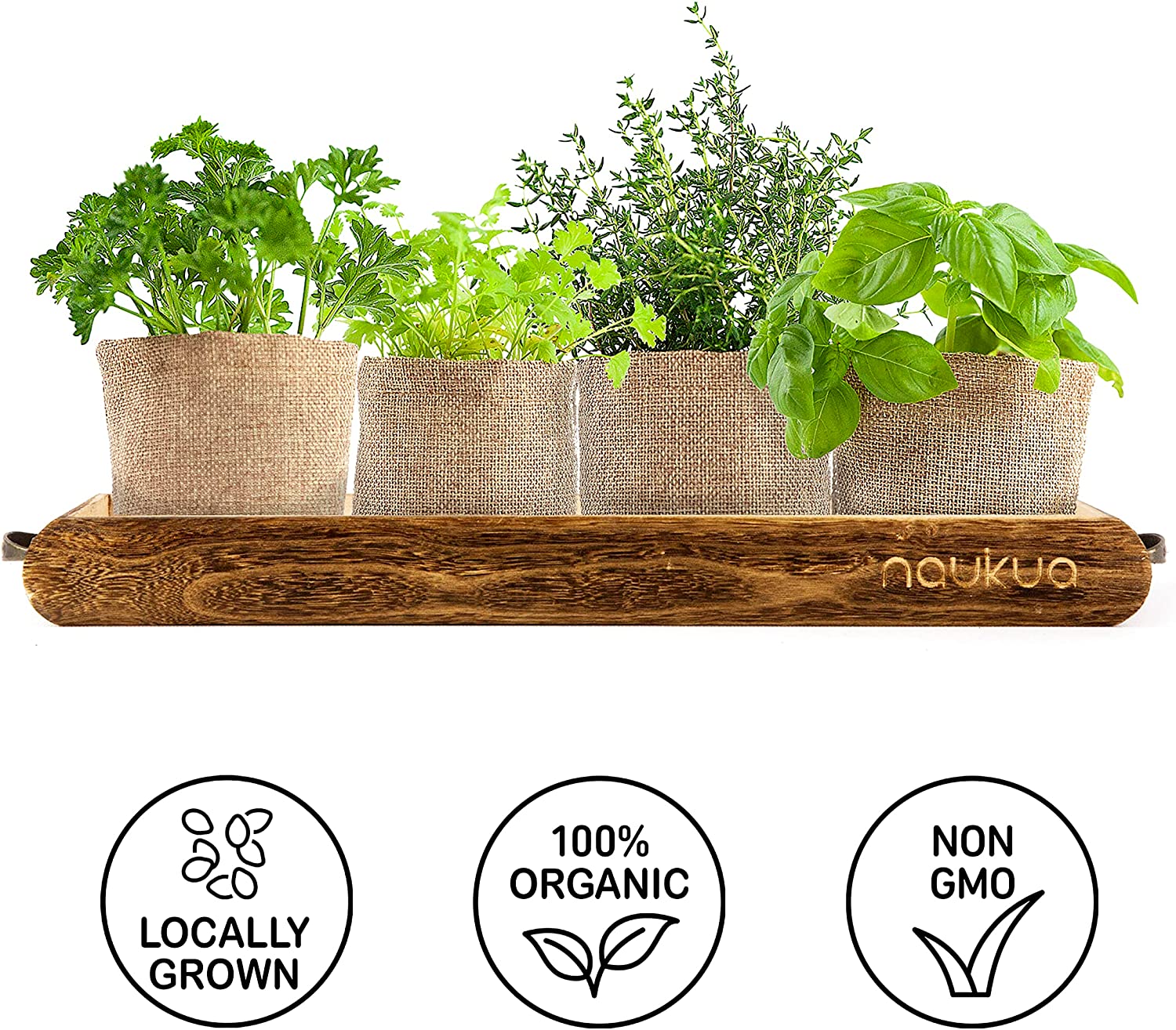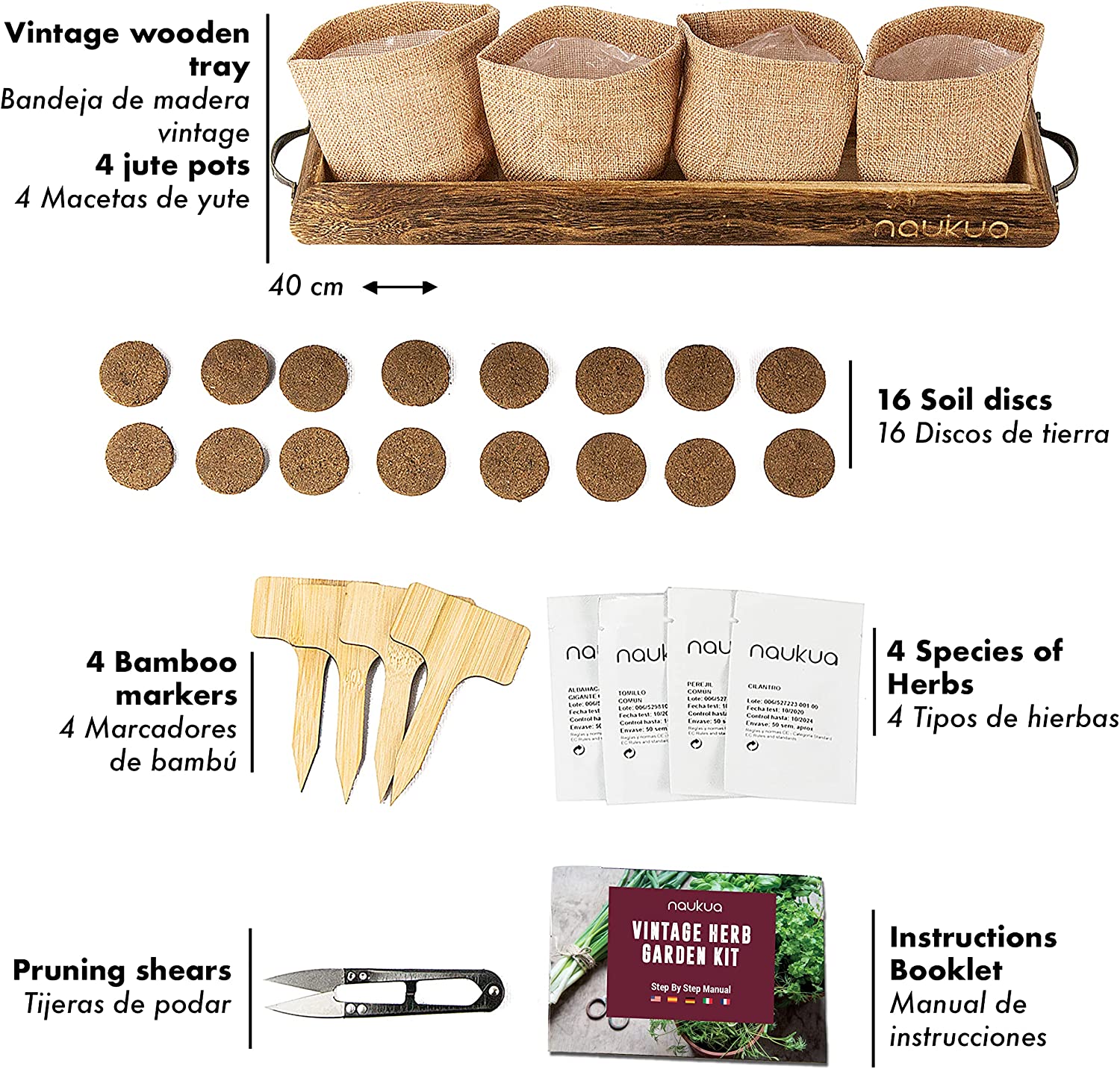 Piante Aromatiche (Timo, Basilico, Prezzemolo e Coriandolo) - Semi Organici dalla Spagna, Contiene 4 tipi di semi aromatici, 1x Vassoio in Legno Vintage, 16x Dischi di Terreno, 4x Vasi in Juta con rivestimento impermeabile, 4x Targhette in Bamboo, Cesoie e Libretto di istruzioni passo a passo in 5 lingue SEMI 100% ORGANICI CRESCIUTI IN SPAGNA - I semi sono organici al 100% e privi di OGM. Sono stati cresciuti con cura lungo la costa mediterranea della Spagna