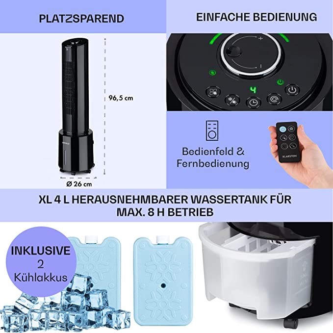 Klarstein Condizionatore Portatile 45W, 5-in-1 Ionizzatore, Climatizzatore, Raffrescatore d'Aria Silenzioso Con Night Mode, Ventilatore, Deumidificatore, Rinfrescatore ad Acqua, 4L,146metri cubi/h, Nero. CONDIZIONATORE 5-IN-1: Progettato per le case in cui lo spazio è prezioso, questo condizionatore d'aria portatile fa circolare l'aria fresca in casa, aggiunge un tocco di umidificazione ed emette ioni negativi per rimuovere inquinanti e allergeni. CON 3 MODALITÀ: scegli tra ventilazione bassa, media e alta o passa alla modalità normale, alla modalità natura che fluttua la velocità del vento o al night mode per una soluzione silenziosa che rallenta la velocità dell’aria prima di spegnersi. PIENA MOBILITÀ IN CASA: Il condizionatore da 45 W funziona in qualsiasi stanza senza bisogno di tubo di scarico. L'ampia oscillazione di 90° non lascia angoli senza aria fredda, fornendo la ventilazione necessaria per rinfrescare le giornate estive - FACILE UTILIZZO: Il telecomando o i comandi integrati rendono semplice il controllo del raffrescatore. L'aggiunta di un timer da 7h e un indicatore del livello dell'acqua aggiungono praticità extra e soddisfano tutte le esigenze di raffreddamento. BASSO CONSUMO E ZERO SPRECHI: Riduci la tua bolletta energetica con il nostro condizionatore portatile senza refrigerante. Il serbatoio ricaricabile da 4L è estraibile per una facile pulizia, mentre le 11h di attività ti coprono quando fa più caldo.