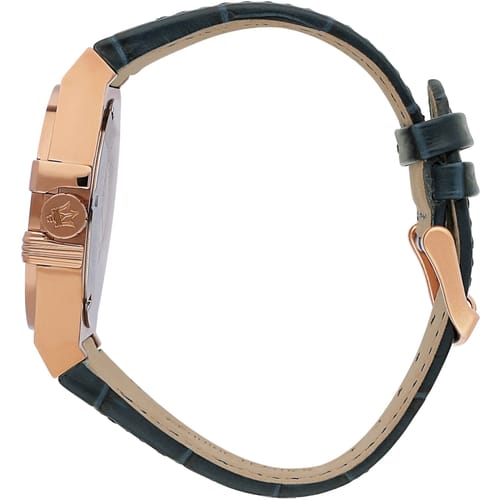 IL TRIDENTE MASERATI DEL BRAND SPICCA CON PREPOTENZA SUL QUADRANTE BLU - LA CASSA ESAGONALE MISURA 2MM - ACCIAIO E CUOIO.