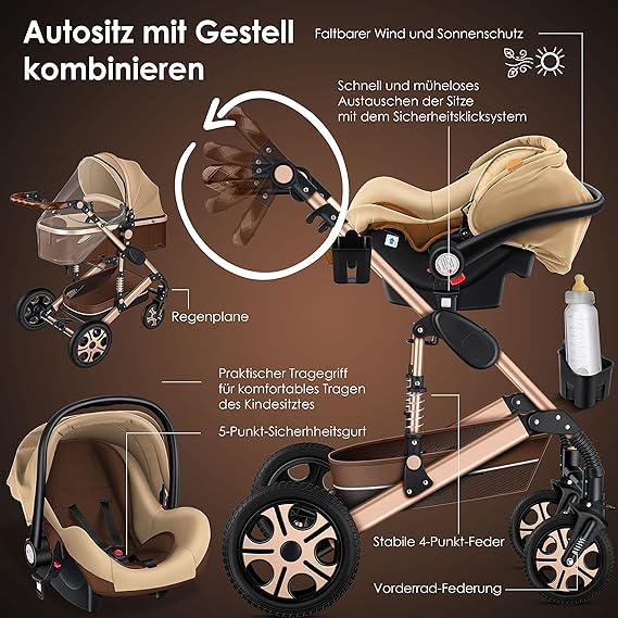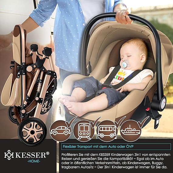 Adatto per bambini dalla nascita fino all'età dei bambini. Il passeggino 3 in 1 con una vasta gamma di accessori ti consente la mobilità ideale fin dalla nascita del tuo bambino. Il passeggino è comodo per il tuo bambino. L'ovetto può essere utilizzato fin dal primo viaggio in auto. Grazie al sistema a clic, l'ovetto si monta facilmente sul telaio, non è necessario alcun adattatore separato. Gli ovetti si agganciano al passeggino con un clic. Uso: lo schienale della navicella e del seggiolino sportivo sono regolabili in modo continuo. Il parasole è regolabile in 4 posizioni, rimovibile e lavabile. La coperta per bambini in colore coordinato è fissata con una cerniera ed è lavabile. Con la navicella avrete il compagno perfetto per dopo la nascita fino a circa 8 mesi se il bambino può sedersi autonomamente. - Sicurezza: non appena il bambino può stare seduto da solo, il passeggino è il compagno perfetto. Con pochi gesti è possibile trasformare il passeggino in passeggino. Per la posizione seduta o sdraiata è possibile scegliere tra 3 posizioni. Inoltre potete decidere anche nella direzione di visualizzazione del vostro bambino. La navicella si trasforma in un seggiolino sportivo in pochi secondi. Il passeggino combinato 3 in 1 si adatta quindi perfettamente alle esigenze del vostro bambino. Facile da montare: grazie al sistema a clic, l'ovetto si monta facilmente sul telaio, non è necessario alcun adattatore separato. Il parasole è sia regolabile che rimovibile e lavabile. Il seggiolino auto in dotazione può essere utilizzato come seggiolino per auto o come inserto per il passeggino, quindi sei ancora più flessibile. Per la nascita fino a un'età di circa 8 mesi. Accessorio versatile: un pratico cestino per riporre la spesa, ecc. Inoltre, sul retro del passeggino si trova una tasca con scomparti. Sul lato si trova un portabevande. Nella confezione sono inclusi anche un parapioggia, una zanzariera e una grande borsa/borsa fasciatoio coordinata con il colore del passeggino che può essere fissata al manubrio.