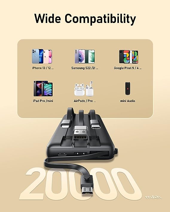 Include cavi Micro, USB C e iOS compatibili con iPhone 14/13/12/11/XR/8/6, iPad, Samsung Galaxy S22/S20, tablet e altri dispositivi smart. Non è necessario prendere alcun cavo di ricarica.- Ricarica per 5 dispositivi contemporaneamente -Power Bank con 5 uscite (3 cavi e una porta USB A + una porta USB C) che può ricaricare 5 dispositivi allo stesso tempo. Ogni porta ha una uscita massima di 5V/2A, il che significa che puoi ottenere una ricarica simultanea ad alta velocità per 5 dispositivi.Display LED intelligente - Ha un esclusivo display LED digitale intelligente che mostra il livello della batteria. La precisione dell'indicatore di potenza è del 100%, quindi puoi vedere chiaramente il livello della batteria. Dimensioni portatili e design con cordino - Con le dimensioni di 6,14×2,75×1 pollici, questa batteria esterna è facile da trasportare. Con il design esclusivo del cordino, puoi appendere la batteria esterna del telefono allo zaino e utilizzare facilmente la banca di energia in qualsiasi momento e ovunque - Tecnologia Esclusiva - Le sicurezze integrate proteggono i tuoi dispositivi da correnti eccessive, surriscaldamento e sovraccarico. Il sistema di sicurezza a multi protezione garantisce una protezione completa per te e i tuoi dispositivi.