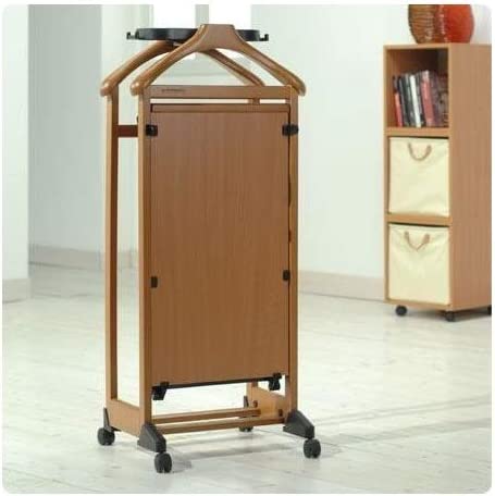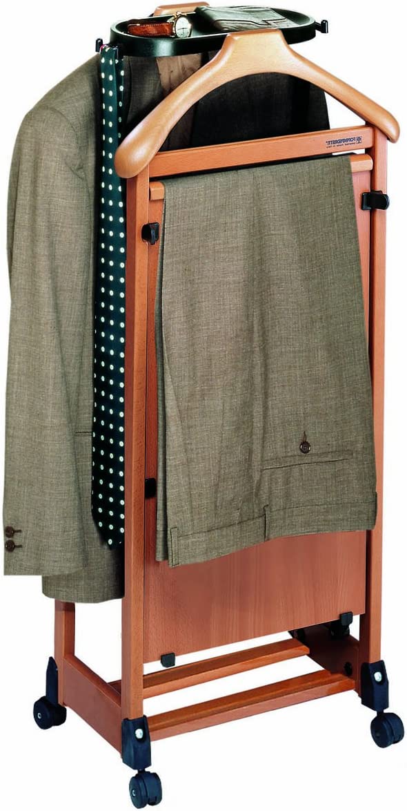 Indossatore da Camera. Marchio Foppapedretti - Colore Noce - Materiale: Legno di faggio, nobilitato, plastica - Usi consigliati per il prodotto: Giacche, Scarpe, Pantaloni, Camicie, Cinture, Cravatte - Caratteristica speciale: Pannello imbottito per tenere in piega i pantaloni. Indossatore da camera dotato di pinze appendigonna regolabili, staffe per pantaloni, vaschetta portaoggettti con ganci per cinture e cravatte, due spalle appendiabiti, pannello imbottito per tenere in piega i pantaloni, base per scarpe. 4 ruote piroettanti. Struttura in legno massiccio di faggio, pannello in truciolare ricoperto, vaschetta in materiale plastico - Dimensioni aperto: 46x28x103 cm