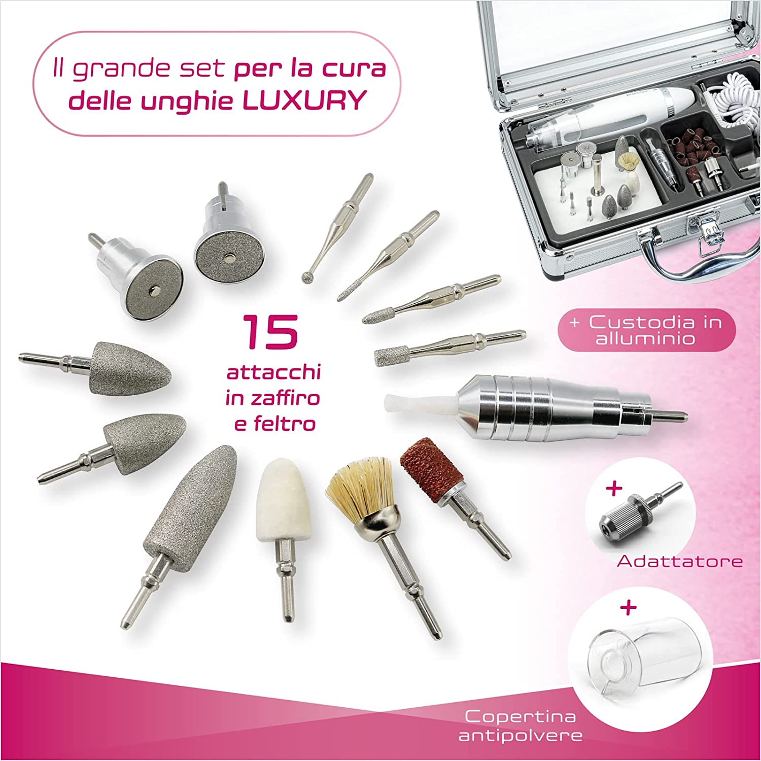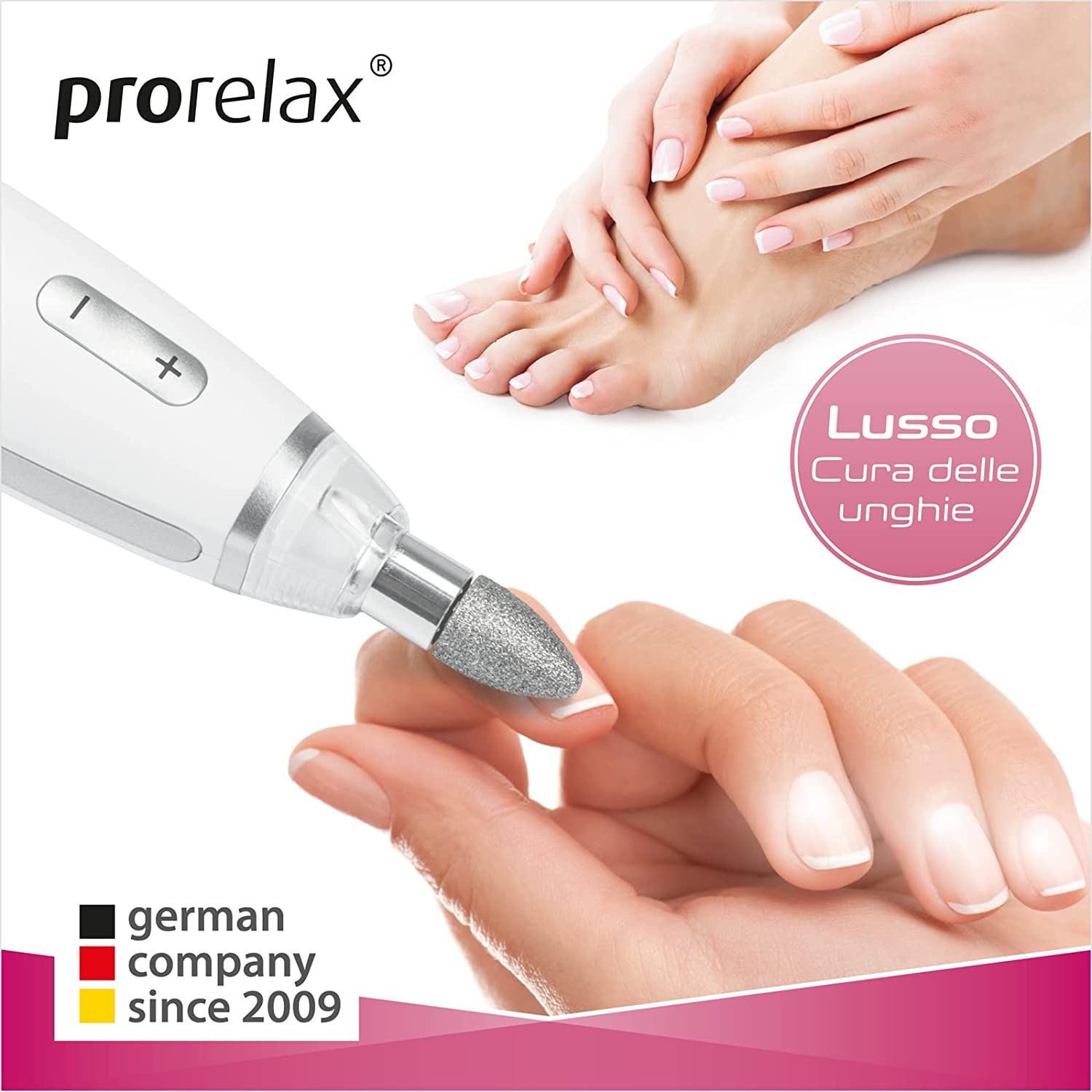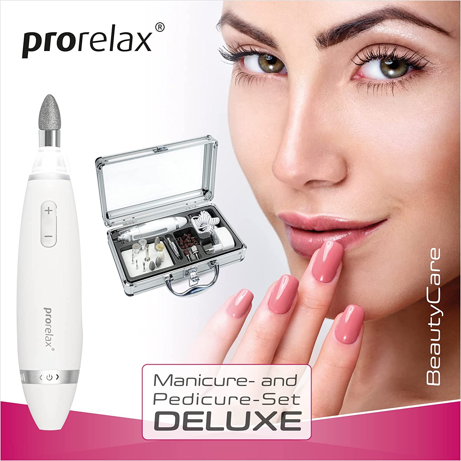 Prorelax Manicure Pedicure Set Deluxe, per Uomini e Donne, Cura Professionale di Mani e Piedi. 15 accessori di Alta Qualità In Acciaio Chirurgico. Luce Led. Set manicure/pedicure di alta qualità per donne e uomini è adatto per accorciare, limare, modellare e lucidare le unghie e per rimuovere calli, cuticole e calli e duroni. Il set professionale per la cura delle unghie contiene 15 accessori di alta qualità in zaffiro e feltro. l potente micro motore con una silenziosa rotazione in senso orario e antiorario ha un controllo della velocità infinitamente variabile da 2.000 a 5.400 giri/min. La superficie di presa perfetta con superficie soft-grip rende il dispositivo comodo da tenere. Il design ergonomico e la luce LED luminosa assicurano la migliore visibilità e una facile manipolazione durante il trattamento.