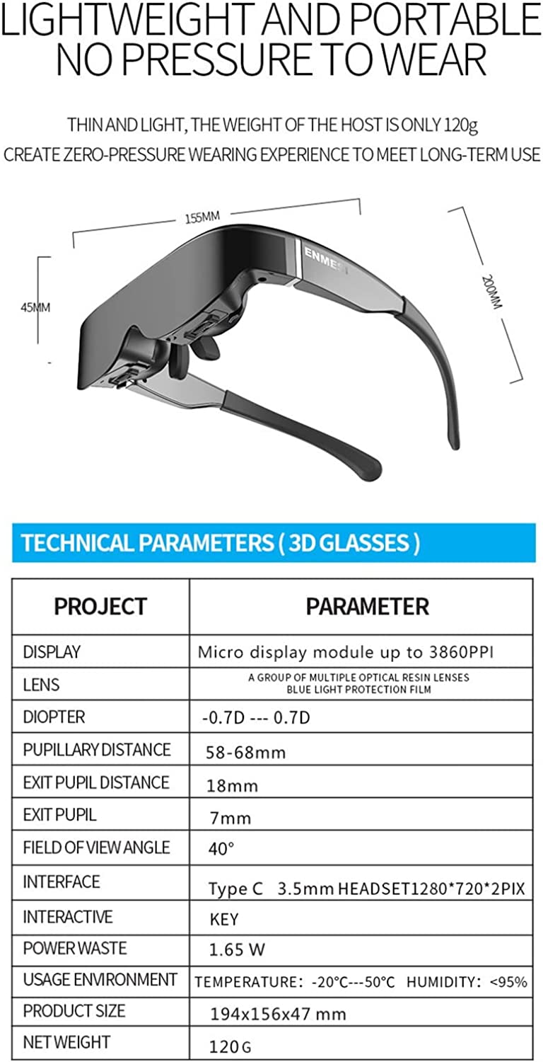 Occhiali retina super intelligenti, Cuffie realtà virtuale 3D VR, rapporto contrasto 100000:1, Visualizzazione 3860 PPI pixel, 2G+memoria 16G Compatibile Android e Windows Mobile. Schermo Giant Effetti visivi per giocare a giochi mobili: Connetti ai telefoni cellulari, i giochi mobili diventano giochi di schermata gigante immersive con giochi professionali Controller, facilità di funzionamento cieco, godimento. Oltre ai telefoni cellulari, può anche essere collegato ai computer, PS4, XBOX, e passare. Sembra di essere sulla scena: aumentare il vero senso tridimensionale dell'immagine, non più disposto a noioso il display 2D piatto. L'immagine è ad alta definizione e confortevole, conforme veramente alle abitudini visive, senza vertigini! Combinazione di lenti in resina multipla, SLR Effetto ottico, riduzione del peso, immagine chiara, i bordi non sono sfocati. Cinema che insegue dramma: nuovi favoriti a casa, guardare film, inseguire i drammi, non tengono più il tuo telefono cellulare e gli effetti visivi cinematografici del computer da immergere te stesso o sedersi o siediti o giacciono a tua discrezione. Il piccolo schermo diventa un enorme potere in un secondo. Dopo il collegamento a un telefono cellulare, lo schermo è enorme e gli effetti visivi cinematografici possono essere apprezzati esclusivamente con un angolo di visione della posizione C. Il tuo teatro portatile: USB-C. Connessione diretta, trasforma immediatamente il tuo piccolo schermo in un teatro, guardando 3D, guardando 4K e giocando a giochi, portandoti in una visione ad alta definizione davvero immersiva. Piccolo e leggero: usura della pressione zero, viso sottile, il peso corporeo principale è solo 120 g per creare un'esperienza di indossamento della pressione zero, per soddisfare l'uso a lungo termine.