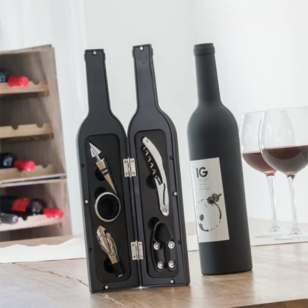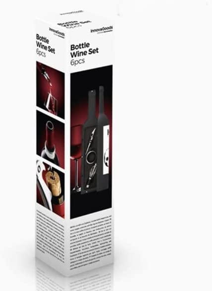 InnovaGoods, Cofanetto di Accessori per Vino a Forma di Bottiglia, Acciaio Inox, Nero, 7 x 7 x 33 cm. Include un tagliacapsule, un tappo per vino, un cavatappi, un anello salvagoccia e un dosatore. Realizzato in ABS, acciaio inox e lega di zinco. Chiusura magnetica.
