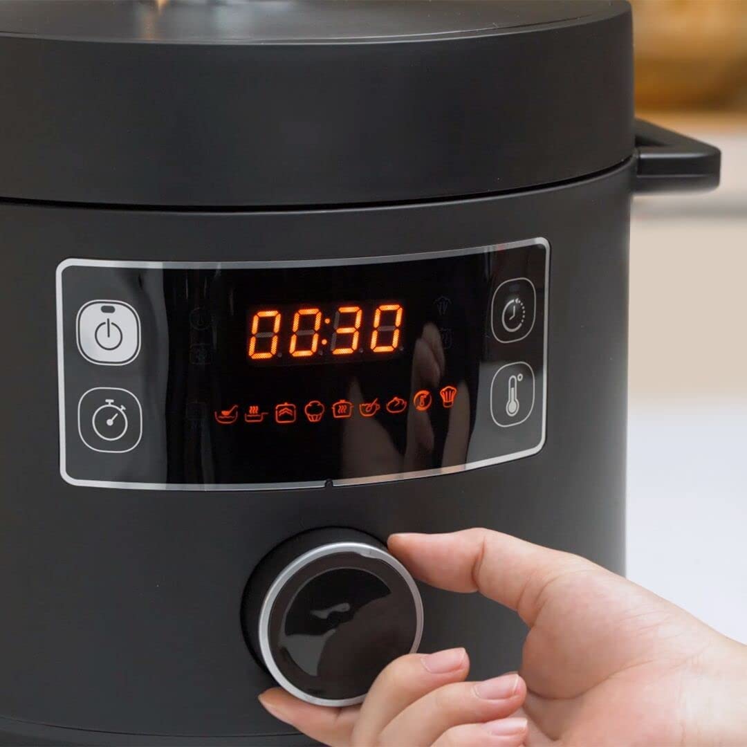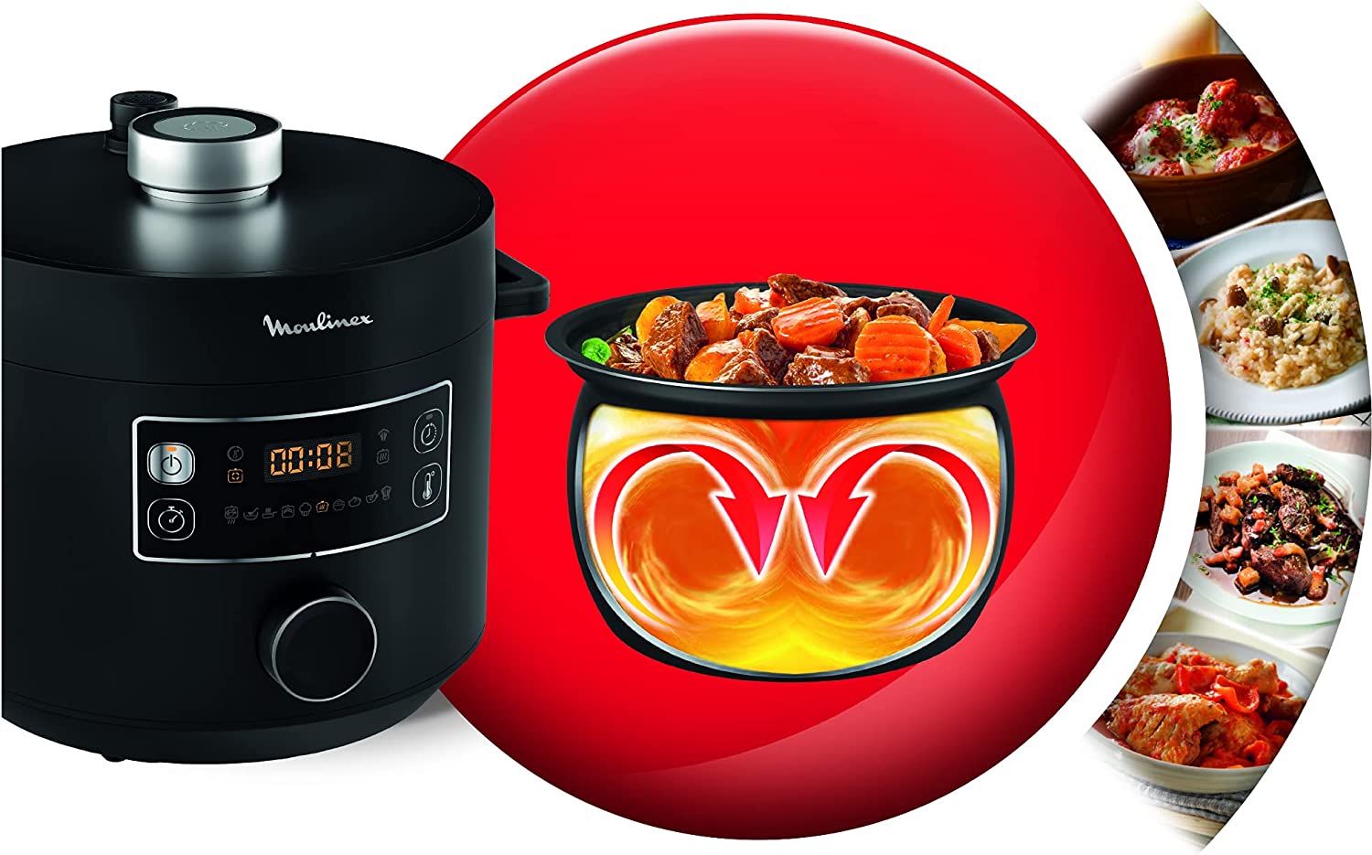 Multicooker Veloce, 5 Litri, Pentola a Pressione Elettrica, Robot da Cucina Multifunzione con Tecnologia Spherical Bowl, 10 Programmi di Cottura Automatici e Ricettario. Il multicooker Moulinex Turbo Cuisine è la soluzione innovativa per cucinare piatti deliziosi in modo facile e veloce, dall'antipasto al dolce, dalla colazione alla cena SPHERICAL COOKING BOWL: La pentola a pressione Moulinex Turbo Cuisine è dotata di tecnologia Spherical Cooking Bowl, che assicura una superficie riscaldata più ampia e una diffusione e circolazione ottimale del calore INTERFACCIA INTUITIVA: Sfrutta un'unica manopola per selezionare il programma di cottura, regolare la temperatura e il tempo o impostare l'avvio posticipato PENTOLA A PRESSIONE ELETTRICA: Con la tecnologia di cottura a pressione ultra rapida e la potenza da 915 a 1090 W, cucini fino a 3 volte più velocemente rispetto alla cottura con un accessorio da cucina tradizionale su gas o piastre elettriche - 10 PROGRAMMI AUTOMATICI: Grazie ai 10 programmi di cottura automatici, sostituisce almeno 7 elettrodomestici da cucina: Cottura in umido, Zuppe, Frittura, Cottura al forno, Sottovuoto e cottura lenta, Porridge, Yogurt e fermentati, Riscaldamento, Modalità Chef regolabile - FUNZIONALITÀ: Cottura automatica senza bisogno di supervisione, avvio ritardato fino a 12 ore e mantenimento al caldo fino a 24 ore; il recipiente di cottura con rivestimento antiaderente è durevole e facile da pulire - SICURA: Turbo Cuisine è dotata di 12 controlli di sicurezza, inclusi: sistema di rilascio della pressione sicuro, nessun contatto con il vapore, nessun rischio di bruciarsi