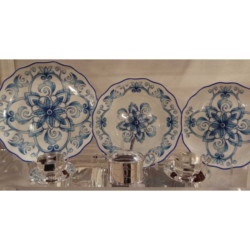 SERVIZIO DI PIATTI 18 PEZZI FINE PORCELLANA - COLLEZIONE PANTELLERIA - DECORI BLU. La Royal Family Sheffield propone la rivisitazione di questi articoli in una chiave più moderna ed attuale, coniugando la creatività del design italiano alla tradizione anglosassone. Attualmente la Royal Family rifornisce oltre tremila punti vendita nel mondo, realizza una gamma vastissima di articoli in tanti materiali pregiati. Oltre agli articoli in Sheffield, la sua collezione comprende una serie vastissima di articoli in smalto ispirata a quelli che tanto piacevano agli zar Russi, una collezione in porcellana, cristalli, ceramiche dipinte a mano e vetri molati. La Royal Family ha prodotto articoli destinati a molte personalità rinomate tra cui: il Presidente Ciampi, i reali di Montecarlo e in occasione del Suo novantesimo compleanno la Regina Elisabetta e tanti personaggi del mondo dello spettacolo. Antichi miti, leggende e tradizioni sono parte integrante dell’oggetto proposto, suscitando in chi acquista un oggetto della Royal Family un coinvolgimento emotivo, rappresentato da sensazioni di augurio, fortuna, amicizia, partecipazione, solidarietà, amore ecc. Per questo chi acquista per sé o per donare ad altri gli articoli della Royal Family, sente di non aver acquistato solo un oggetto, ma spesso recepisce l’idea e la filosofia che sta alla base della sua creazione. Il servizio di piatti della collezione