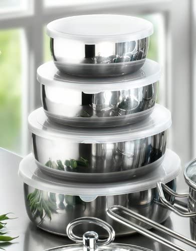 Karcher Set di pentole Jasmin (Acciaio Inossidabile, 20 Pezzi, incl. Coperchio in Vetro e Set di Ciotole in Acciaio Inossidabile, induzione). Composizione: 1 casseruola con manico e coperchio in vetro (14 cm); 4 pentole con coperchio in vetro (16 cm, 18 cm, 20 cm, 22 cm); 1 tegame da stufato con coperchio in vetro (22 cm); 4 ciotole con coperchio (20 cm, 18 cm, 15 cm, 13 cm) Materiale: in pregiato acciaio inox (non si deforma, non altera i sapori, è semplice da pulire) - Caratteristiche: adatta a tutti i piani cottura (compresi quelli a induzione), lavabile in lavastoviglie, utilizzabile in forno fino a 240°C , fondo incapsulato con isolamento termico