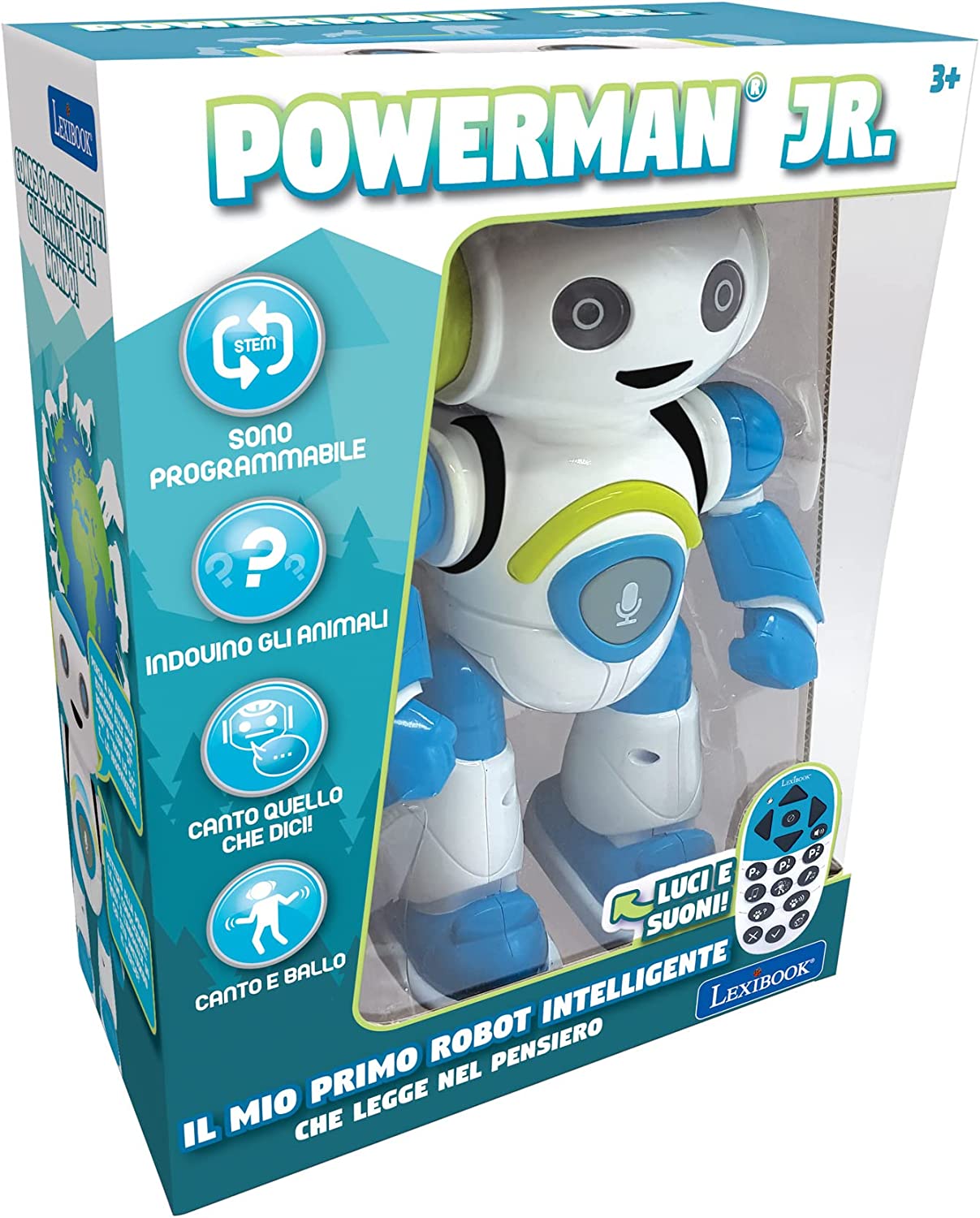 Robot parlante che balla, suona la musica, emette suoni di animali e altre sorprese! Suoni ed effetti di luce! (bambini 3+). Indovina gli animali - Contiene un'incredibile modalità di indovinare gli animali: il bambino pensa a un animale, Powerman JR. farà alcune domande a cui rispondere con Sì/No/Non so, e cercherà di indovinarlo! Unicorno, lama, gatto, cane, bradipo. Una vera sfida per trovare un animale che ancora non conosce - Programmabile - Programma fino a 40 azioni con la possibilità di aggiungere musica per creare i tuoi balli e coreografie che lui memorizzerà - Ripete dopo di te - Con la funzione di riproduzione e registrazione, può ripetere ciò che dici con la sua divertente voce da robot. Include una funzione karaoke, dove ripeterà in canzone - Riutilizzerà anche in seguito ciò che gli viene insegnato. Con telecomando controllalo in avanti, indietro, a destra e a sinistra, può andare in qualsiasi direzione!