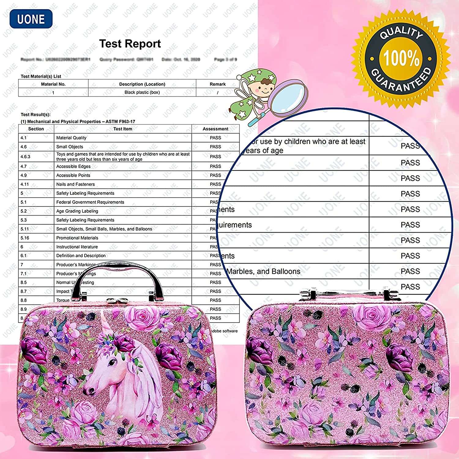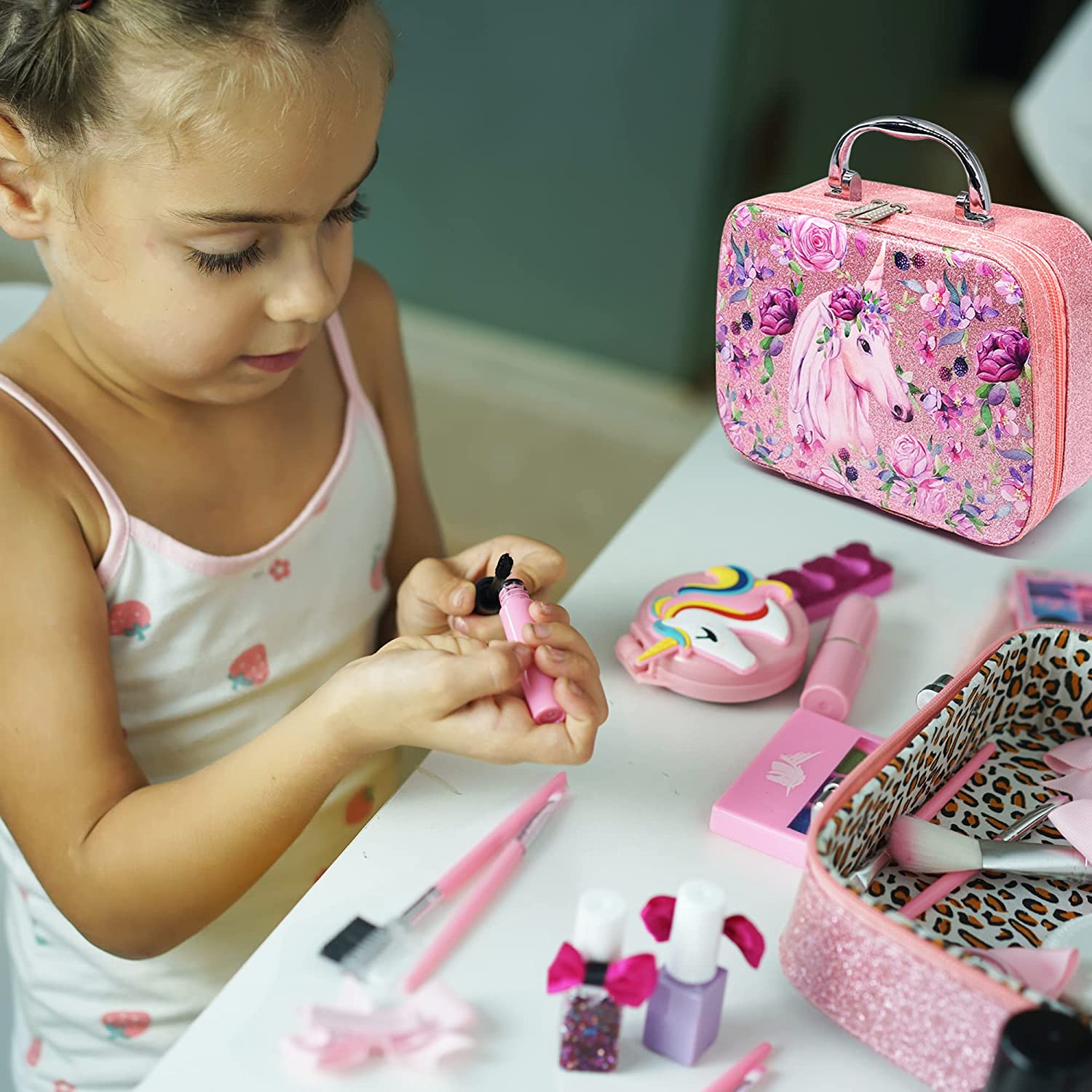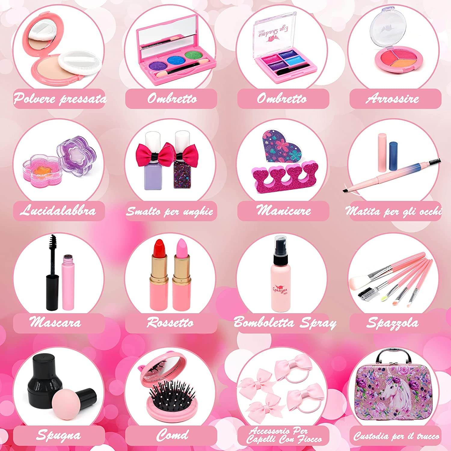 Trucco per ragazze Il set per il trucco lavabile di grande capacità consente alla tua bambina di organizzare e raccogliere giocattoli cosmetici sparsi. Comodo da trasportare Adatto alla maggior parte delle borse, kit per il trucco per bambini per ragazza, può essere facilmente trasportato ovunque. Non adatto per bambini piccoli che potrebbero ingerire dei pezzi. Atossico e sottoposto ai controlli di sicurezza e tollerabilità