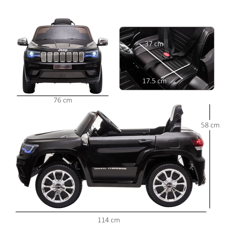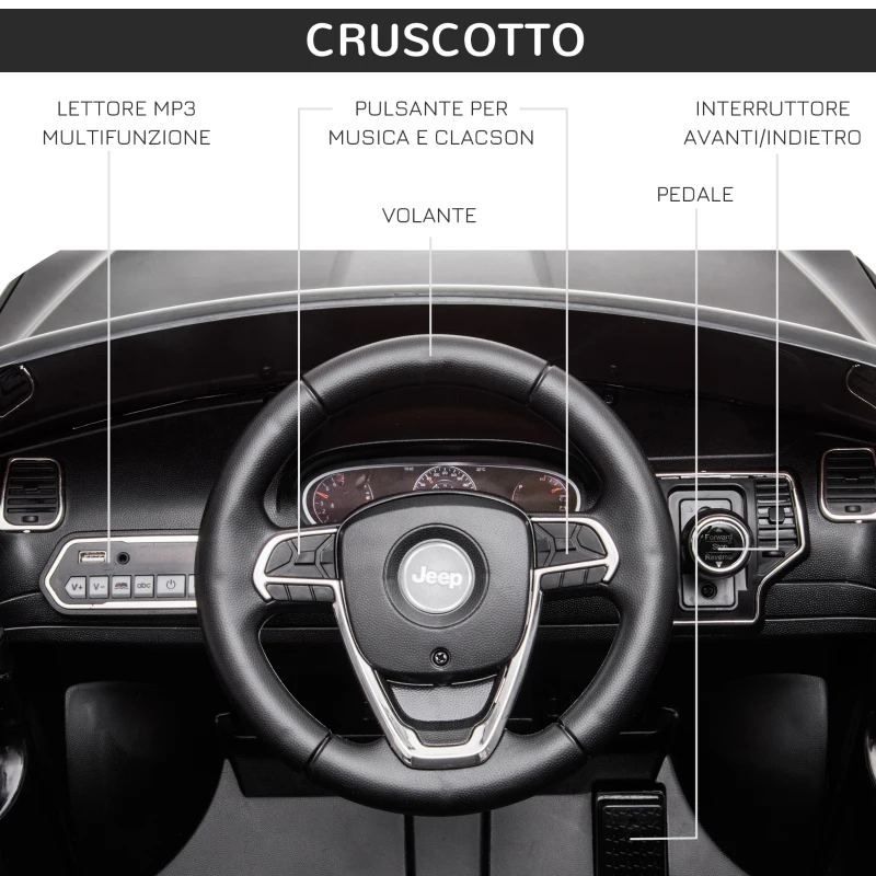 Macchina Elettrica Jeep per Bambini 12V Guida Manuale e con Telecomando. MACCHININA CON LICENZA UFFFICIALE: Questa macchina elettrica per bambini ha il design della vera Jeep Cherokee! I fari funzionanti, i suoni, le portiere apribili e le cinture di sicurezza rendono questa macchina giocattolo realistica e perfetta per bambini da 3-6 anni. MASSIMA SICUREZZA: La jeep per bambini offre una guida sicura e confortevole, grazie alle ruote larghe, all'ammortizzazione e alle cinture. La macchinina elettrica con motore doppio ha una velocità iniziale contenuta e regolabile da 0-3km/h, per lasciare ai bimbi il tempo di reazione quando iniziano a guidare. FACILE DA CONTROLLARE: Ci sono 2 modalità di guida: la macchina elettrica può essere guidata in autonomia dai bambini oppure controllata a distanza dai genitori con il telecomando. MUSICA E LUCI: Accompagna le loro gite al volante con della buona musica. La jeep elettrica per bambini è dotata di 10 musiche integrate e ha una presa USB e MP3 per collegare le tue canzoni preferite. In più è possibile accendere e spegnere i fari autonomamente. DIMENSIONI: Dimensioni generali: 114L x 76P x 58Acm. Capacità di peso: 30kg. Batteria: 12V 7AH. Certificazioni: EN71-1-2-3, EN62115.