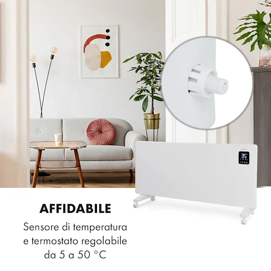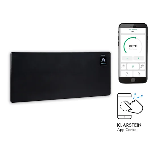 Smart home: gestibile tramite Wi-Fi e Klarstein App Experience per Android o iOS - Potente: 2500 Watt di potenza riscaldante per locali fino a 50 m quadri. Preciso e intuitivo: display LED con pannello touch per impostare il timer 24 ore e quello settimanale. Bansin Smart 2500, Termoconvettore, Controllo con App, 2500W - Eleganza smart: il termoconvettore Bansin Smart 2500 di Klarstein non assicura solo un piacevole tepore, ma, grazie all'intelligente controllo tramite Wi-Fi, è sempre pronto all'uso, ovunque siate. Con una potenza di 2500 Watt, la stufa Bansin Smart 2500 di Klarstein porta calore in locali fino a 50 m². Un termostato integrato, in collaborazione con il sensore di rilevamento della temperatura, permette un'impostazione tra 5 e 50 °C. Timer e timer settimanale permettono un utilizzo mirato, accendendo e spegnendo il convettore in base alle impostazioni inserite. Il pannello in vetro e metallo di Bansin Smart 2500 di Klarstein è dotato di protezione dagli spruzzi d'acqua IP24 ed è quindi ideale per l'uso in bagno e cucina. L'installazione risulta particolarmente flessibile, grazie alla possibilità di montaggio fisso a parete e all'utilizzo come dispositivo a posizionamento libero con rotelle. Per garantirvi sempre il totale controllo, Bansin Smart 2500 fa parte della Klarstein App Experience, che permette la gestione di uno o più dispositivi tramite smartphone. Così avrete sempre la certezza di trovare il vostro bagno caldo ad attendervi quando rientrate a casa o di non rischiare di riscaldare inutilmente, se vi doveste dimenticare di spegnere il convettore. Ovviamente, il controllo è possibile anche tramite pannello touch e display LED sul lato anteriore del dispositivo.