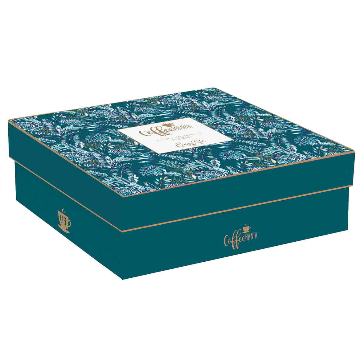 Set 6 tazzine con piattini JUNGLE. Design di grande tendenza, lo stile jungle è entrato prepotentemente nelle case di tanti amanti dell’arredo moderno. Anche le nostre porcellane si sono adeguate al trend del momento: foglie, paesaggi e sfumature di verde in ogni forma. Un omaggio all’atmosfera tropicale. Confezione da 6 pezzi - Materiale: porcellana - Cura del prodotto: adatto per lavastoviglie e microonde - Elementi: 6 tazzine da caffè con piattino e scatola regalo litografata - Decorazione: design tropicale, colori e forme che richiamano la natura - Design italiano