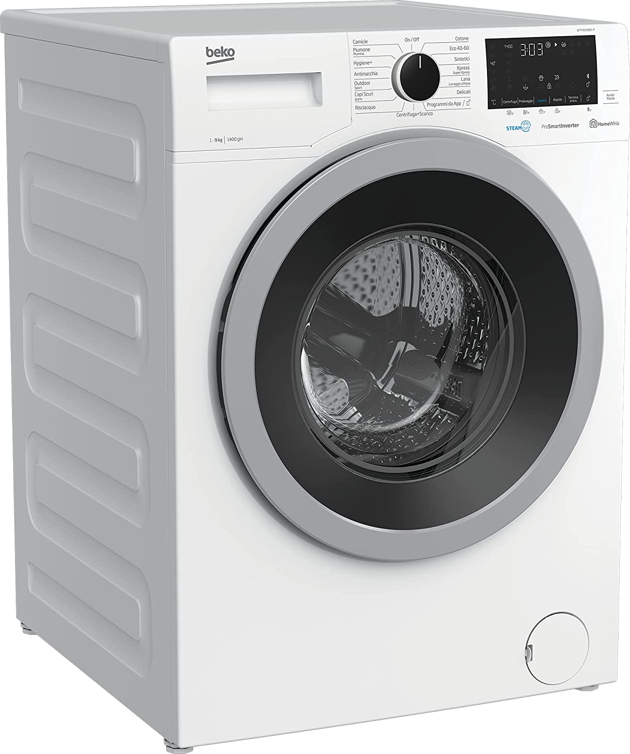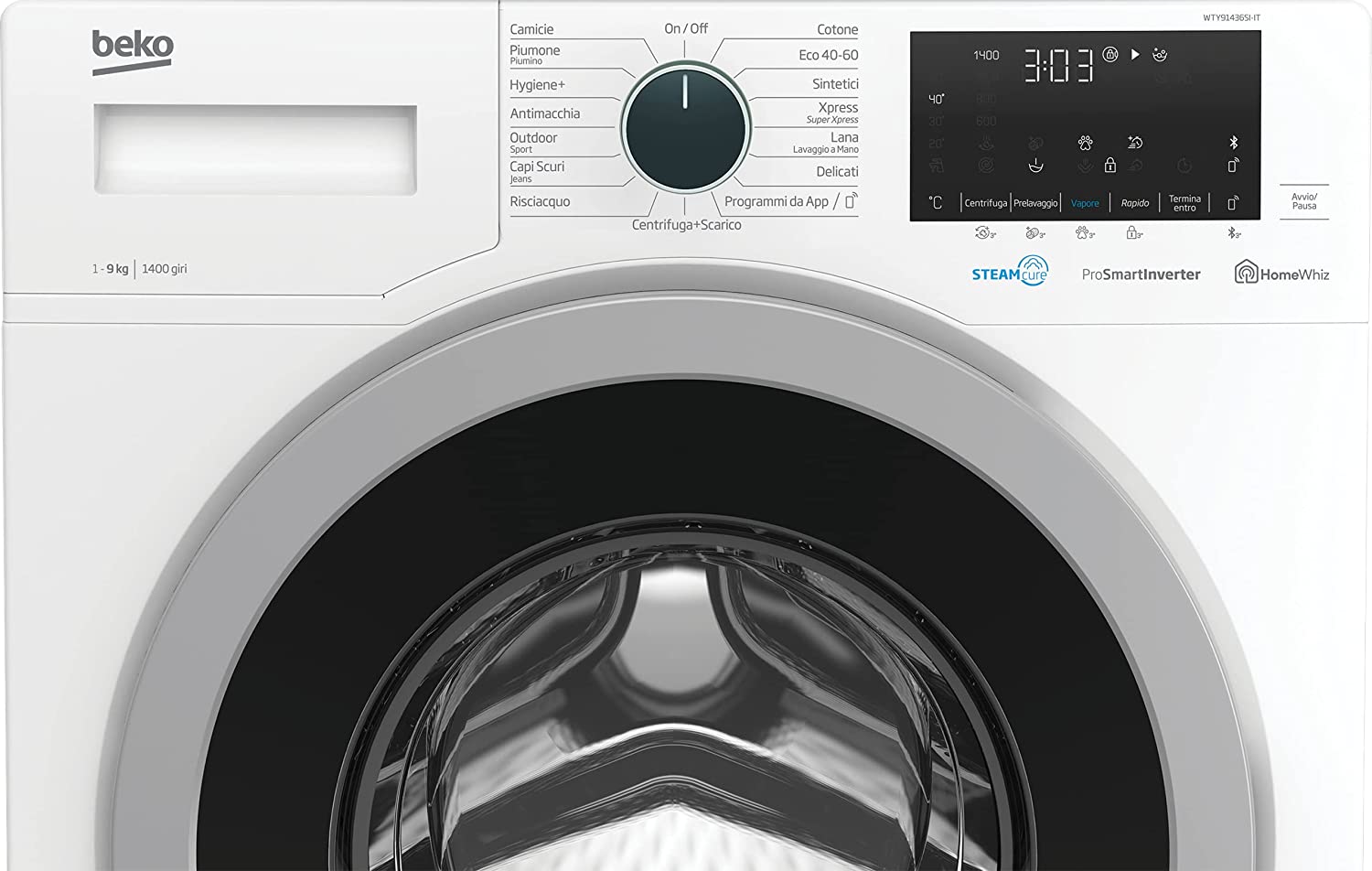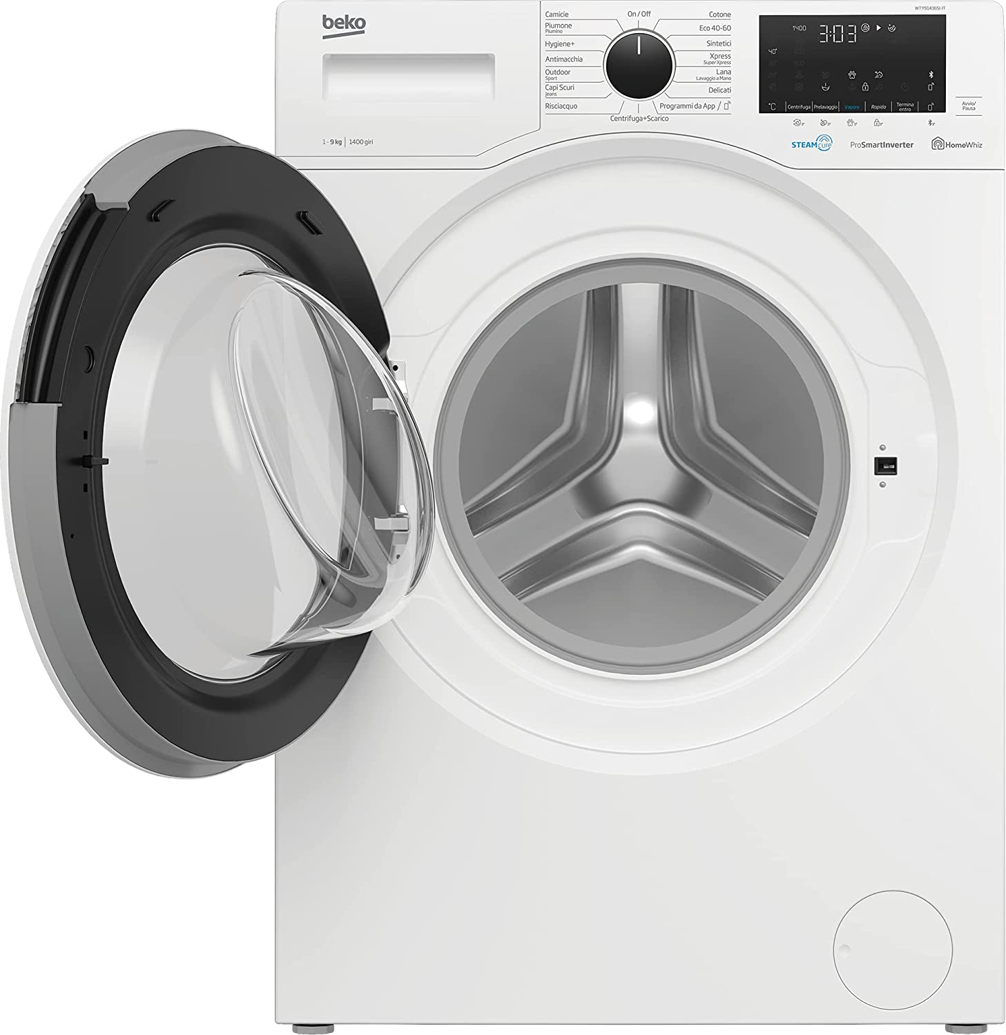 Beko - Lavatrice con Vapore Igienizzante SteamCure - 9 kg, 1400 giri/min, Motore ProSmart Inverter, Classe B, Bianco [Classe di efficienza energetica B]. Lavatrice con trattamento Anti-Macchia con immissione di vapore 9kg, 1400 giri/minuto, Classe energetica B, Display Digit, 15 Programmi, Connessione Bluetooth HomeWhiz - VAPORE IGIENIZZANTE SteamCure: Applicando il vapore prima del lavaggio, ammorbidendo lo sporco e semplificandone la rimozione. Riduce inoltre le pieghe, così potrai scordarti del ferro da stiro - MOTORE ProSmart INVERTER: Offre un'elevata efficienza energetica, ridotti livelli acustici e maggiore durata nel tempo, il tutto in un'unica soluzione - PROGRAMMA StainExpert: Che sia caffè, salsa di pomodoro, cioccolato, fondotinta o sangue, StainExpert sa come eliminare 24 tipi diversi di macchie, così non dovrai mai più pretrattare i tuoi capi - PROGRAMMA Xpress Super Short 14 Min: Non tutti i capi richiedono un lavaggio intenso. A volte, è sufficiente un trattamento veloce. Questo programma ti permette di lavare fino a 2 kg di bucato in soli 14 minuti - CESTELLO AquaWave: Con il vetro curvo dell'oblò e l'esclusivo moto ondoso prodotto dalle pale all'interno del cestello, il sistema AquaWave tratta i capi più delicatamente migliorandone l'asciugatura