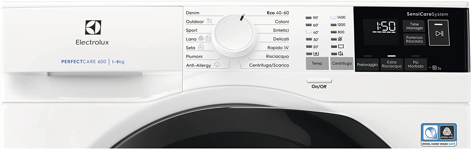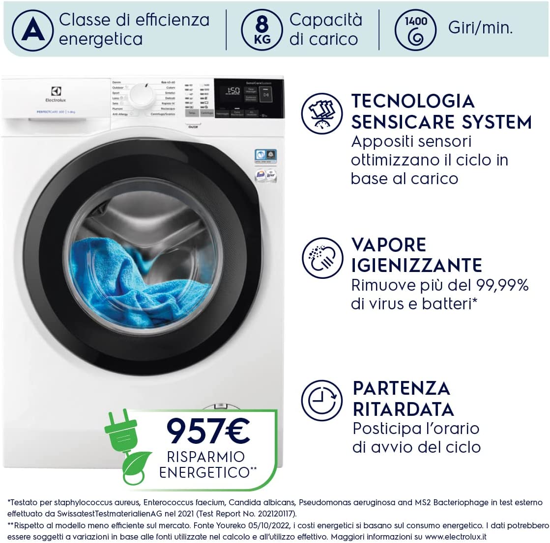 Electrolux Lavatrice a carica frontale EW6F484S PerfectCare 600 con SensiCare System con cesto Gentle Care, 8 kg, Classe A, Bianco [Classe di efficienza energetica A]. La tecnologia SensiCare System regola in automatico grazie ad appositi sensori il ciclo in base al carico, garantendo un risparmio di tempo, acqua ed energia per un lavaggio delicato e sostenibile. Dimensioni 59.6 x 54.7 x 84.7 cm; 68.5 Kg. Riduci la durata dei cicli di lavaggio in base alle tue esigenze. Basta selezionare la funzione Time Manager sul pannello per ridurre la durata del ciclo fino a quattro volte. Ottimi risultati di lavaggio proprio quando vuoi tu. Il programma Vapore Igienizzante rimuove più del 99,99% di virus e batteri*, senza rinunciare alle migliori prestazioni di lavaggio. Unisce l'azione del vapore ad un ciclo di lavaggio profondo, per risultati ottimali. La funzione partenza ritardata ti consente di posticipare l'orario di avvio del ciclo di lavaggio, per evitare che i capi puliti rimangano nel cestello per ore.
