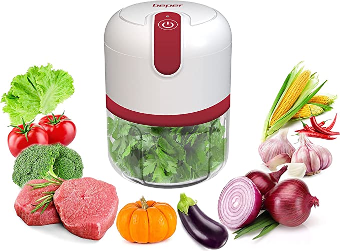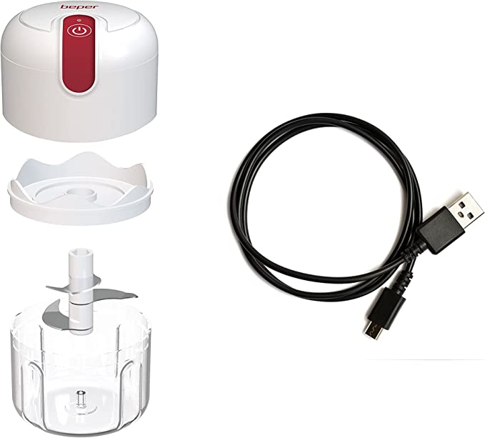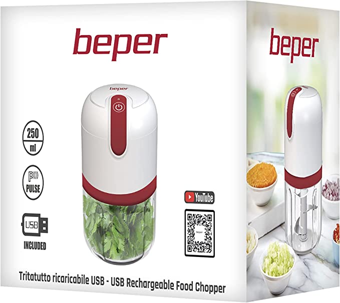 Il Tritatutto ricaricabile Beper grazie alla struttura compatta e all’assenza di filo è perfetto per tritare in pochi minuti tutti gli ingredienti per le vostre preparazioni - USB - Dotato di batteria 1500 mAh al litio ricaricabile in sole 5 ore con cavo USB per un utilizzo in autonomia fino a 20 cicli - Il tritatutto è realizzato in acciaio inossidabile, ABS e contenitore in PP. Tutti materiali atossici che ti consentiranno di mettere a contatto gli alimenti in maniera sicura per tutta la famiglia - Un pulsante a pressione per accendere o spegnere il mini tritatutto, basta riempire il contenitore da 250 ml con i tuoi ingredienti, bloccare il coperchio, puoi ottenere un cibo perfettamente sminuzzato uniformemente in pochi secondi