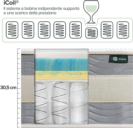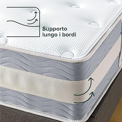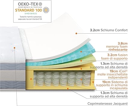 CM 80 X 190 - FRESCA, RESISTENTE AI MOVIMENTI E COMODA - La nostra memory foam in gel Cooling Swirl e il sistema a bobina indipendente eliminano il calore eccessivo e i movimenti del tuo partner durante il sonno, per permetterti di dormire in tutta tranquillità e senza sudare SCHIUMA CONFORMANTE E MOLLE INSACCHETTATE - Strati di schiuma morbida e confortevole, memory foam con gel cooling swirl, fusion foam di supporto e molle insacchettate indipendenti che isolano i movimenti forniscono una riduzione della pressione personalizzata e ti garantiscono un sonno fresco e ristoratore CERTIFICAZIONI OEKO-TEX – Schiuma di altissima qualità e dotata di certificazione OEKO-TEX in merito a durata, prestazioni e contenuto CONFEZIONATO IN MODO ESPERTO - La nostra tecnologia permette di comprimere efficacemente questo materasso in una confezione, in modo che sia facile da spedire e da trasportare in camera da letto; ti basterà semplicemente aprire la confezione e srotolare: il materasso si occuperà di tutto il resto, espandendosi e ripristinando la sua forma originale entro 72 ore