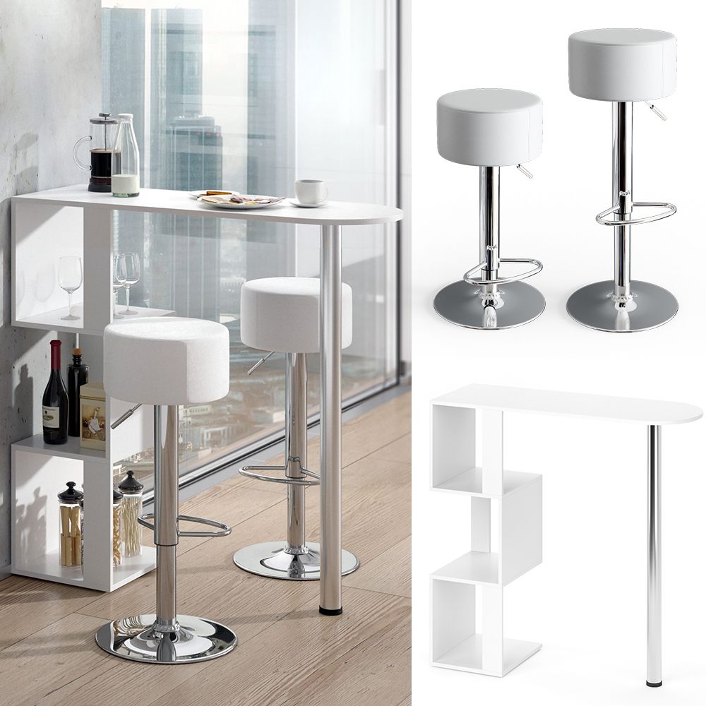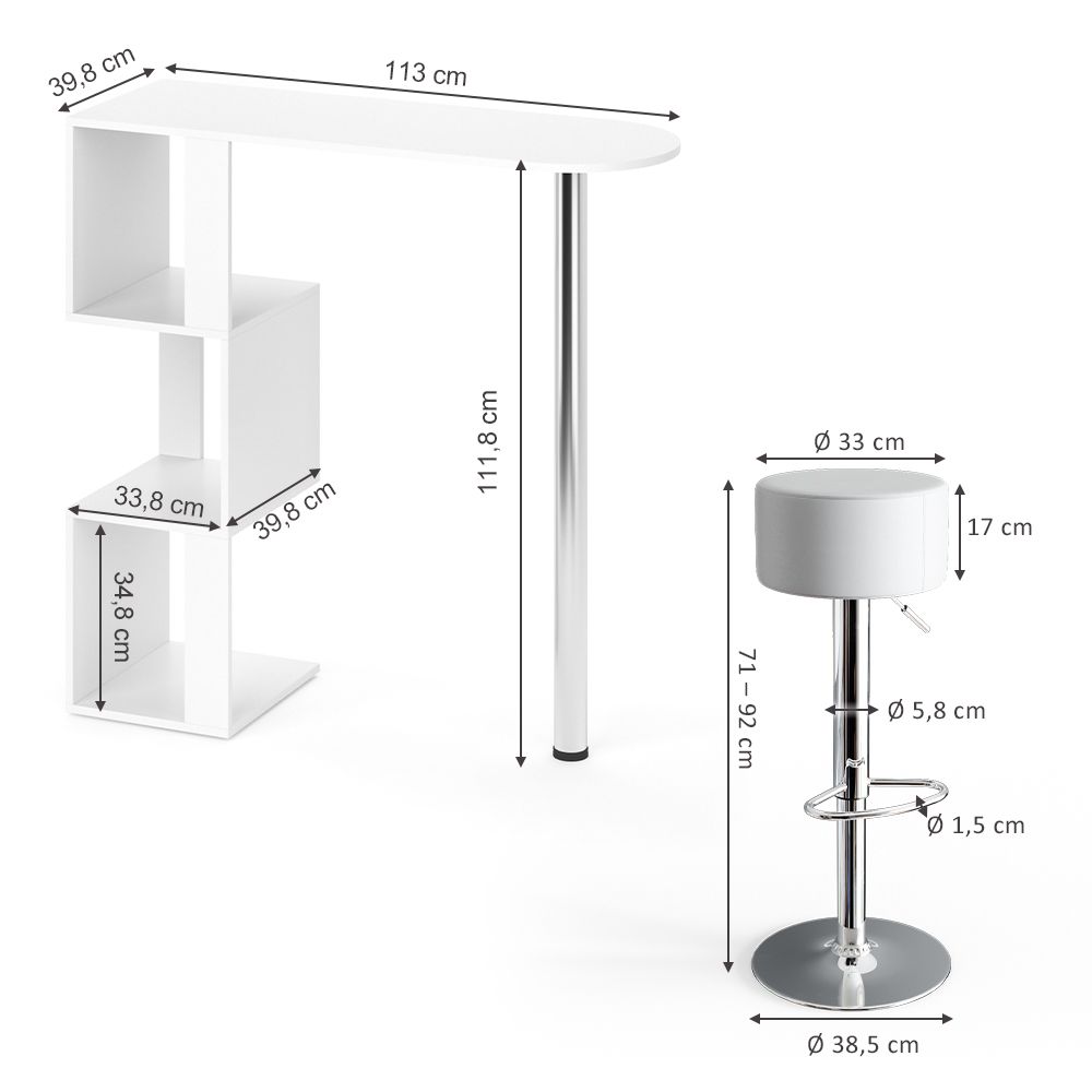Tavolino bar: 113 x 111,8 x 39,8 cm (ampiezza x altezza x profondità). Piano di lavoro: 113 x 39,8 cm (ampiezza x profondità) . Ripiano: 33,8 x 34,8 x 39,8 cm (ampiezza x altezza x profondità) - Diametro del tubo circolare: Ø 60 mm - Sgabello da bar - Altezza (regolabile): 71 – 92 cm (altezza) - Seduta: Ø 33 x 17 cm (ampiezza x altezza) - Piedino: Ø 38,5 cm - Peso Tavolino bar: 17,2 kg. Sgabello da bar: 5,5 kg - Materiale: Tavolino bar corpo: Truciolato 16 mm, rivestimento in resina melamminica - Tubo circolare: Metallo, cromato - Sgabello da bar struttura: Metallo, cromo, Seduta: Poliuretano - 3 ripiani –Con bordi ABS